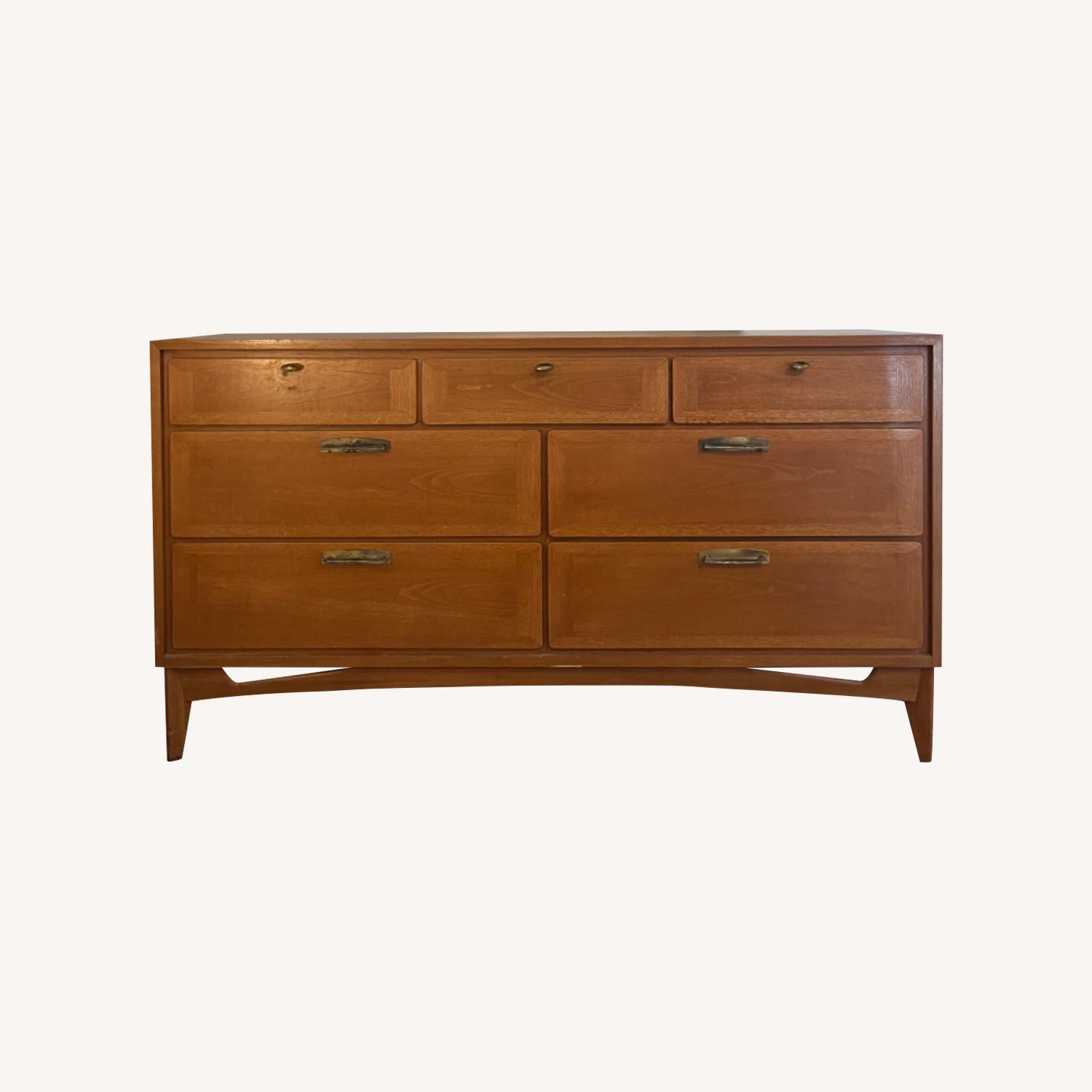Seller's Notes:Vintage 7 drawer dresser by RedLion Furniture Co. Wear is consistent with age plus a couple chips on its bottom edge (shown in pictures). The dresser has a lighter patina to it that defines the inlay boarder and drawer details.