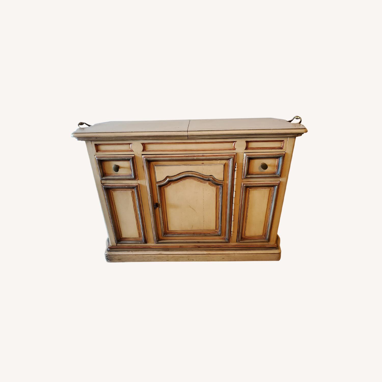 Seller's Notes:This 1970s style server features a velvet top drawer for storing your silver or other utensils. It is also the perfect place to keep your alcohol as the top expands an additional 20" to serve as a bar! A great storage piece for the living room or dining room! It's definitely had a well-lived life and could use some TLC. Could make for a great restoration project! Negotiable!