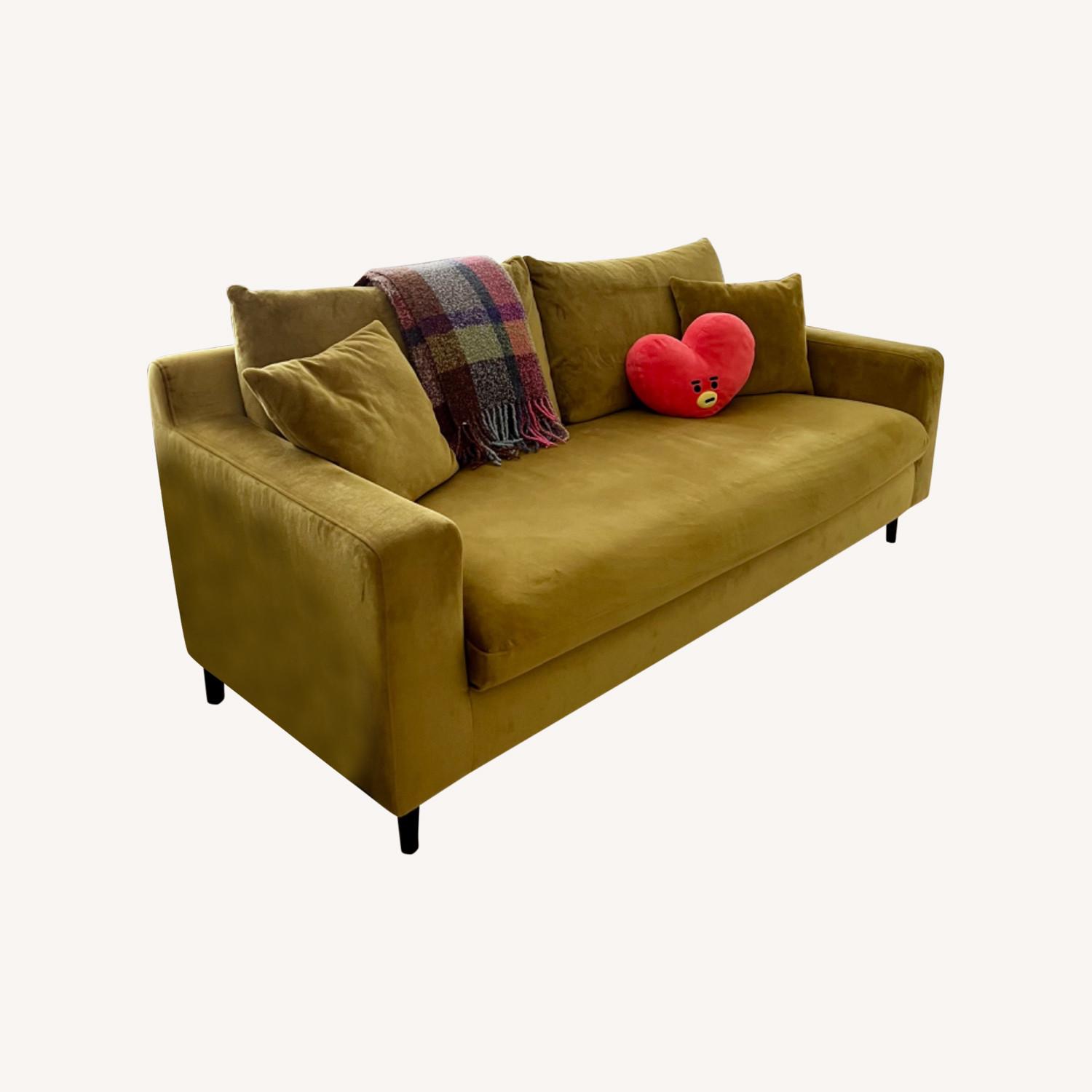 Seller's Notes:Purchased 3 years ago. Gently used. Beautiful chartreuse color, called “Citrine” on the Interior Define site. Original price $1575 75” length 28” seat depth (formerly, their "deep" size) Comes with both down-filled 18” square pillows.