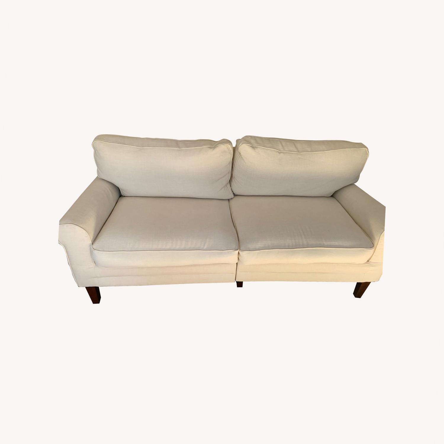 Seller's Notes:Meet your new favorite sofa! Classic yet modern with rolled arms and sleek lines— goes with any decor. Upholstered in buttercream no-pill polyester performance fabric gives it a clean, tailored look. ITEM DETAILS: Ideal for small spaces, this 78” sofa offers comfortable seating for up to 3 people. Compact and stylish, perfect for apartments, lofts, or home offices. • Brand: Serta • Dimensions: 78” W x 32.5” D x 35” H CONDITION: Outstanding! No stains or rips. Barely used. Sofa came in a single box. Can be easily disassembled and carried in a passenger vehicle. MATERIALS & CARE: Durable no-pill polyester fabric. Removable cushion covers for easy cleaning. Spot clean with a damp cloth. FEATURES & SPECS: • Seat Depth: 20.5 inches • Seat Height: 20 inches • Arm Height: 22.75 inches • Cushions: Loose back pillows, pocket coil seat cushions for comfort • Frame: Solid wood with sturdy support •. Velcro keeps cushions in place.