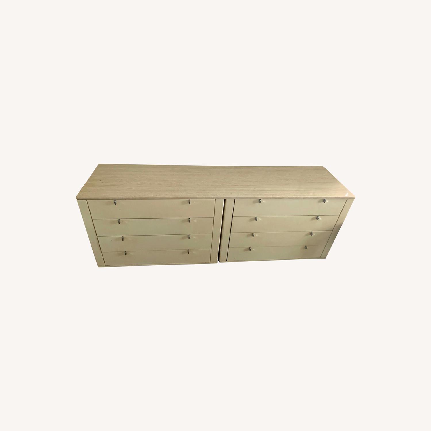Seller's Notes:This is a cream-colored, 8-drawer dresser with a custom travertine marble top, and chrome pulls. It consists of two separate 4-drawer dressers with the top spanning both. The two are not attached (which is why a slight gap is visible in the picture) but it would be easy enough to connect them. The top is also unattached but its weight keeps it solidly in place. Well cared for in a smoke-free, pet-free, child-free home. Also available (listed separately) is a set of two matching 4-drawer nightstands with marble tops.