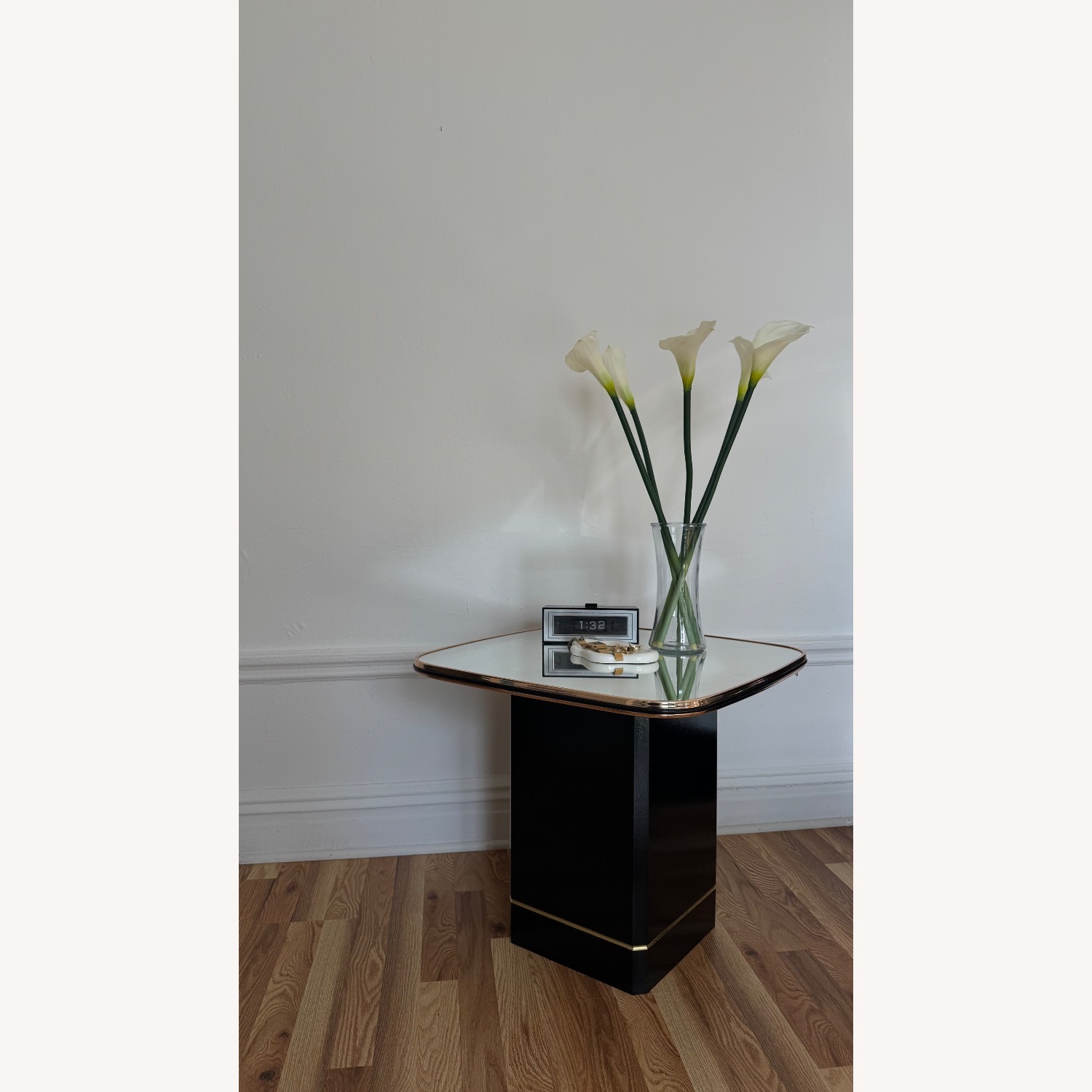 Seller's Notes:Vintage 1980’s postmodern side table with mirrored glass top and gold accents. Stunning like new condition.