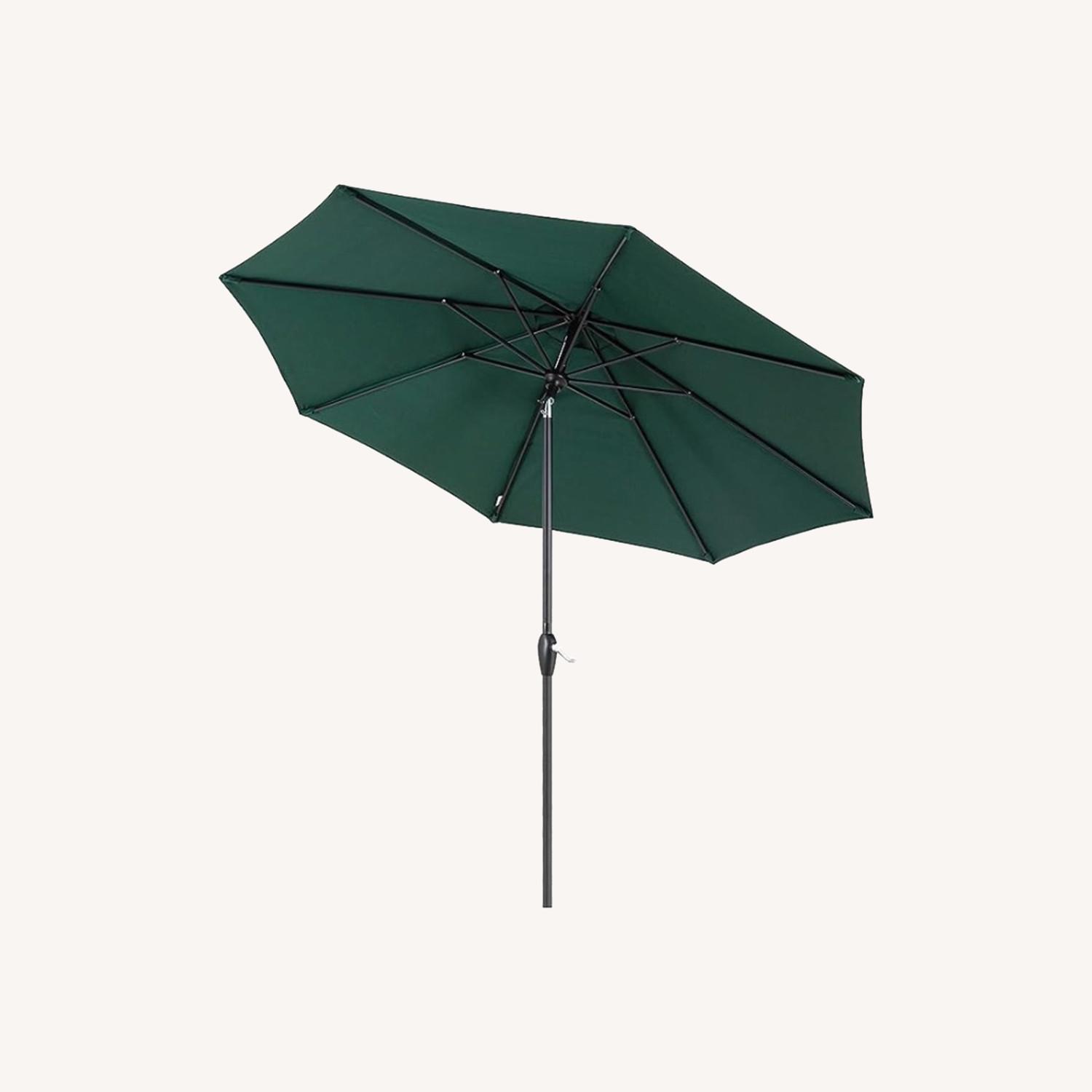 Seller's Notes:Less than two years old, still many good years left. This 9' forest green umbrella has been perfect for our outdoor patio. Designed with an easy auto-tilt function. Keep turning the crank handle when the outdoor umbrella is fully open, you'll get the tilted shade and enjoy the all-day outdoors. It comes with a fillable umbrella base (can be filled with sand or water). Wind and fade resistant.