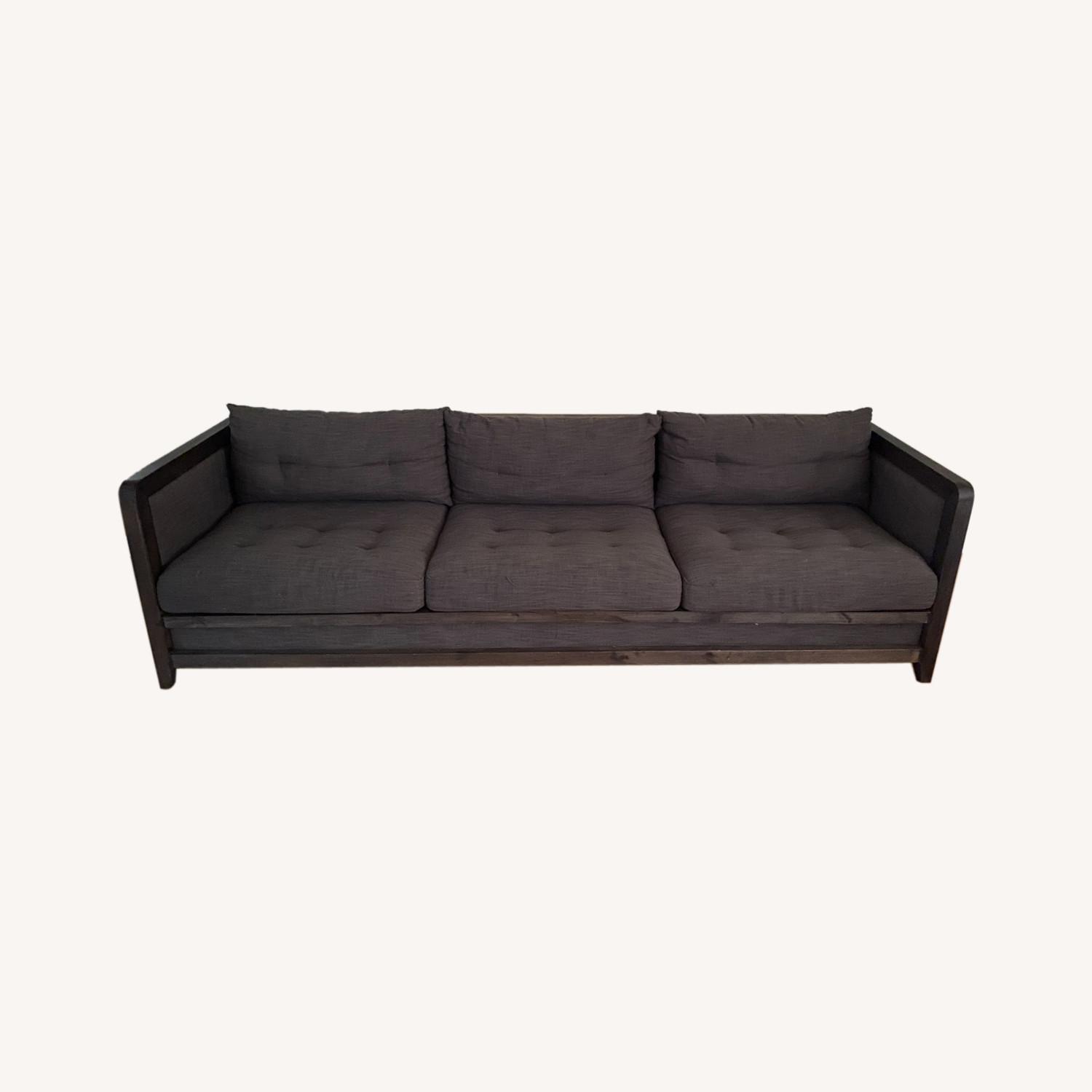 Seller's Notes:This rustic sofa is reminiscent of the rh shelter arm sofa with an approachable price. Upholstered in a handsome smoky grey linen fabric and filled with firm foam, this sofa is finished with reclaimed wood trim for a modern twist on a classic design. It has a low profile, which makes a room feel larger.