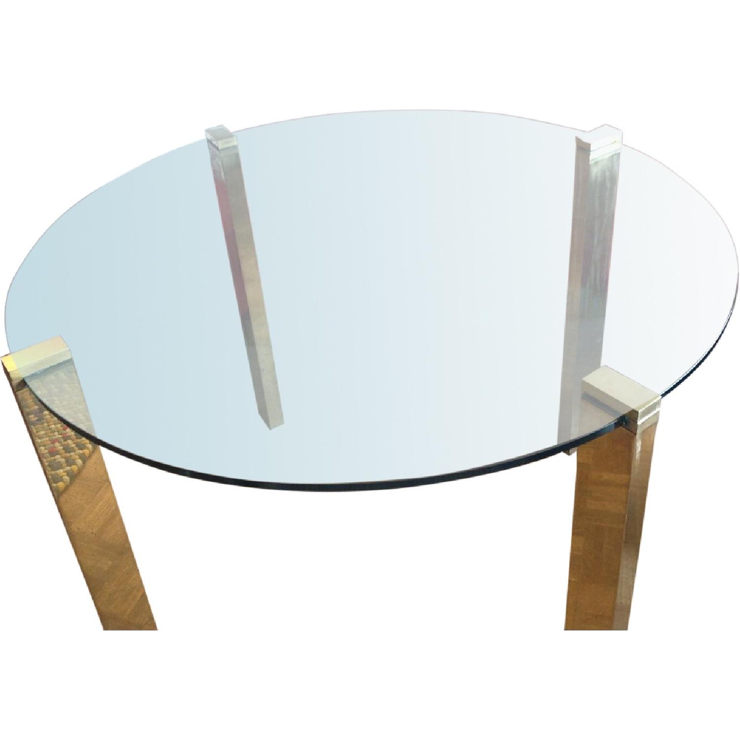 Seller's Notes:Striking brass and glass dining table. There are no chips and only very minor scratches. Brass shows normal oxidation.