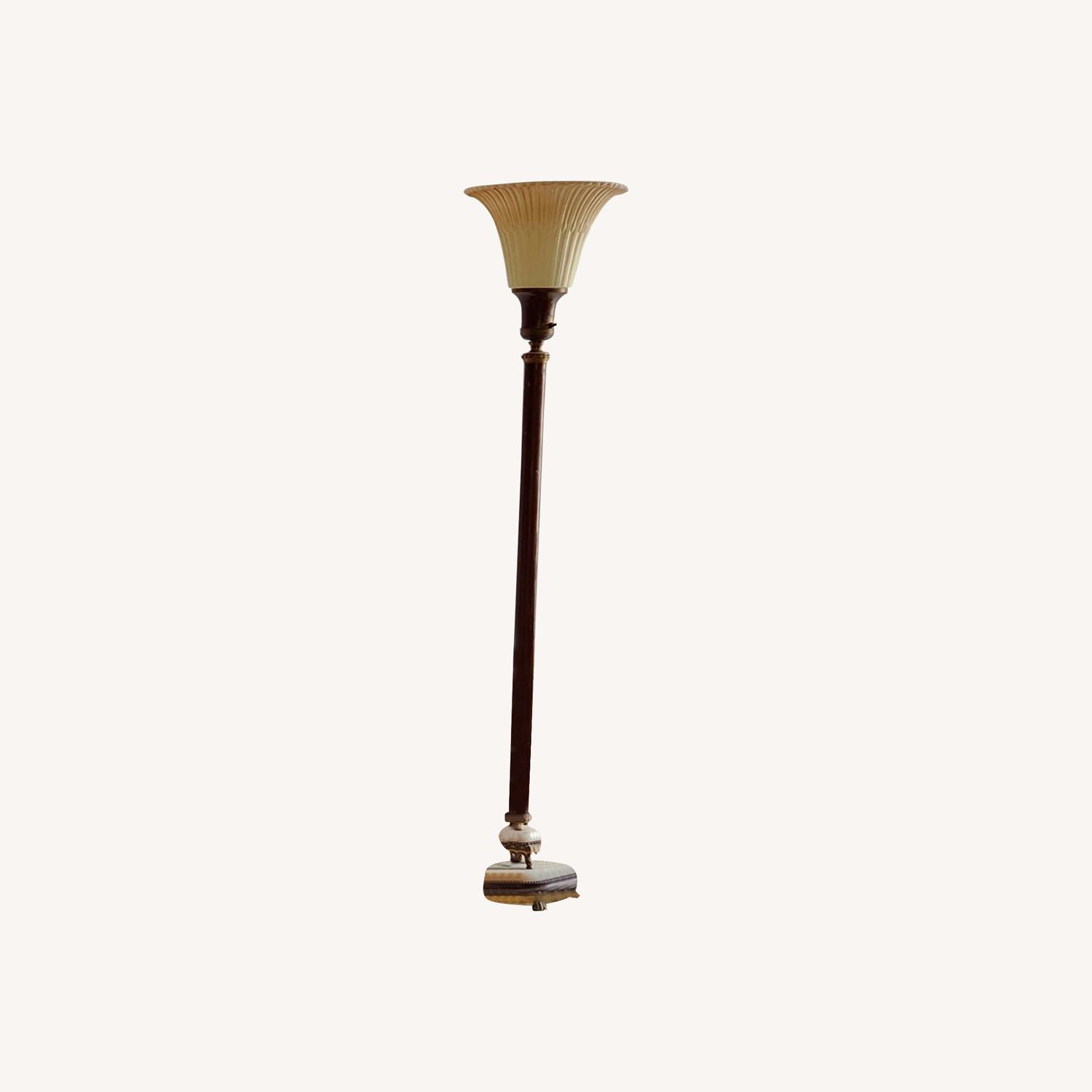 Seller's Notes:A Brass Lamp with lacquer leg, marble and brass base, fluted glass shade....gives off a beautiful romantic light