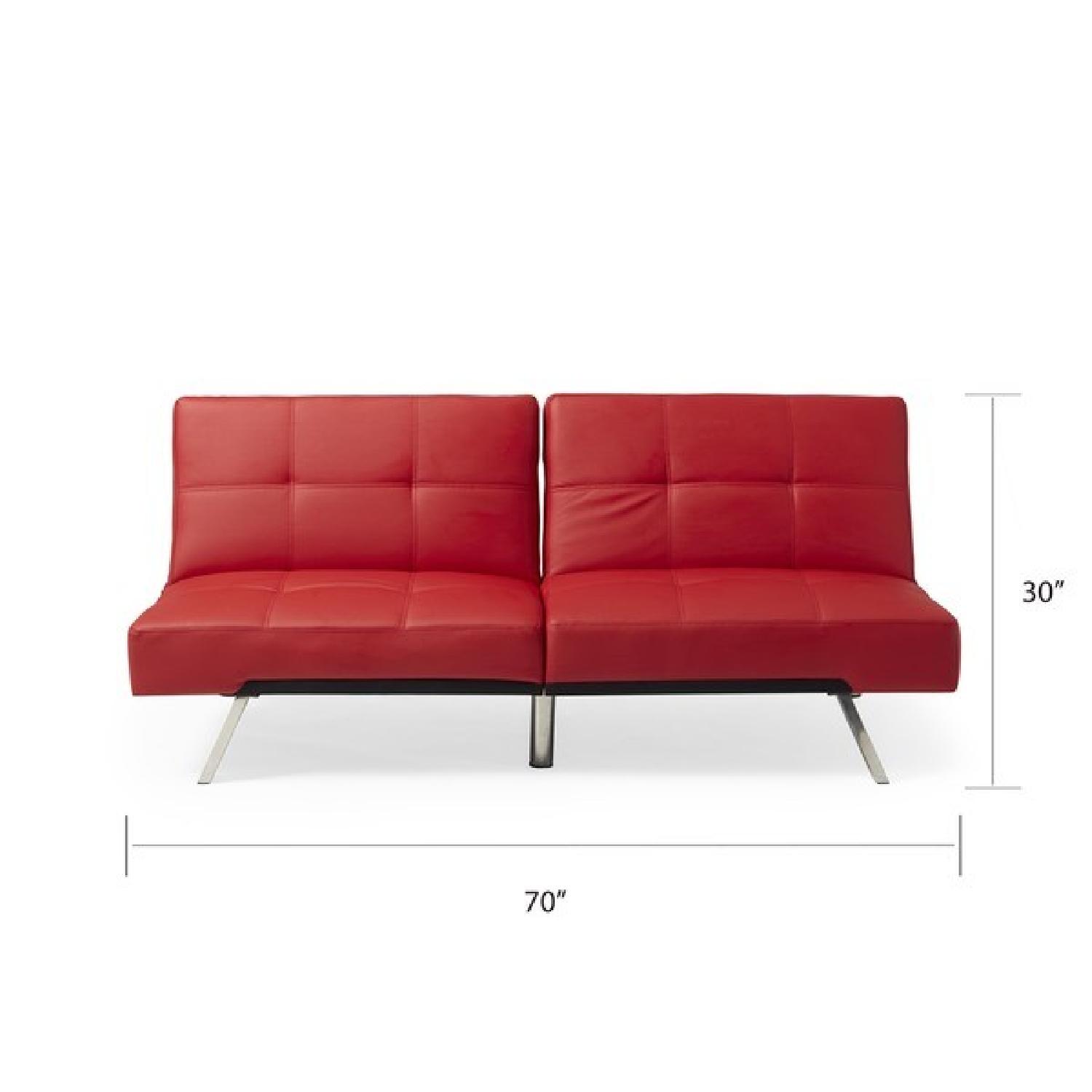 Seller's Notes:Brand new as only used for display (barely ever sit or sleep on it) - reason of sale: I am moving to a bigger apartment and will buy other furniture. Give your room modern appeal and eye-popping color with this red leather futon. This sleeper sofa has a split-back design and will allow you to kick back and relax. Unwind in your living room with the back reclined, or use it in a spare room for a modern guest retreat. The futon easily converts from a bed to a seated position for maximum versatility. Details: Red bonded leather Pop of chrome Single futon set Split-back is adjustable Easily converts from bed to recliner Made with wood construction High-density, convoluted foam Dimensions: Seat: 14.5 inches wide x 22 inches deep Sofa: 30 inches high x 70 inches wide x 36 inches deep Bed: 70 inches wide x 43.5 inches deep