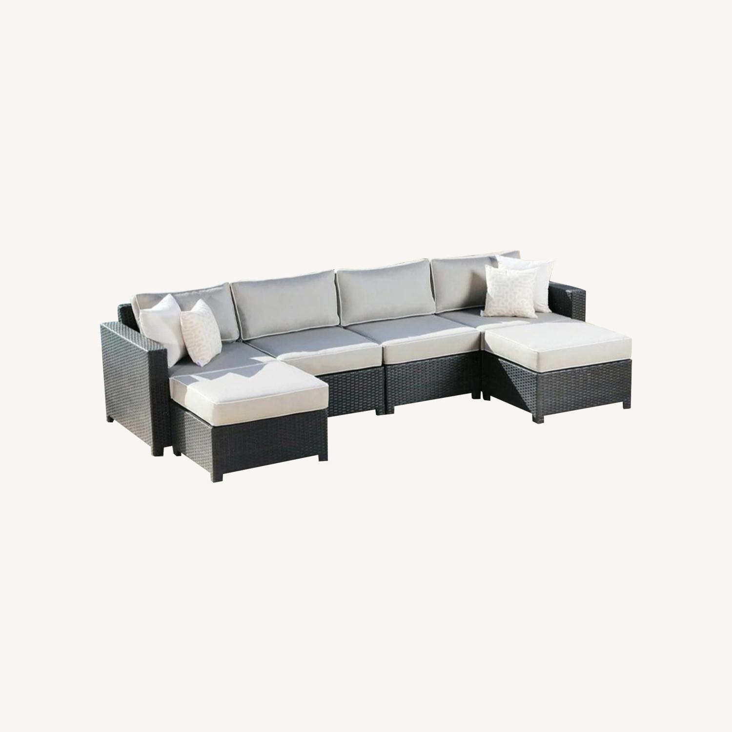Seller's Notes:We’re moving and no longer have space for the item. Lightly used outdoor sofa. Includes two armless chairs, left-facing armchair, right-facing armchair and two ottomans. Also includes decorative throw pillows. There is some minor damage to wicker. Currently sells for $3,495 new Link to item here: https://www.abbyson.com/products/monaco-6-piece-modular-set?variant=40634711670983 Overall Dimensions: 126 W X 61 D X 31 H Armless Chair: 29 W X 35 D X 31 H Right facing armchair: 34 W X 35 D X 31 H Left facing armchair: 34 W X 35 D X 31 H Ottoman: 29 W X 26 D X 19 H