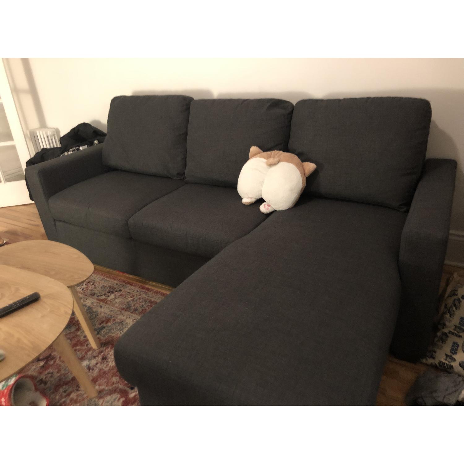 Seller's Notes:We are moving out to the Midwest and cannot take this couch with us unfortunately. Perfect for guests to use as a sleeper, and also perfect for using as extra storage. Color is nice, pillows are comfortable. Slight wear, but otherwise in good condition. The pull out sleeper is SO easy! Also comes in different parts, so its very very easy to assemble and move into apt. We had a difficult hallway / door set up, so it was great for it to come disassembled and for us to easily piece the parts together.
