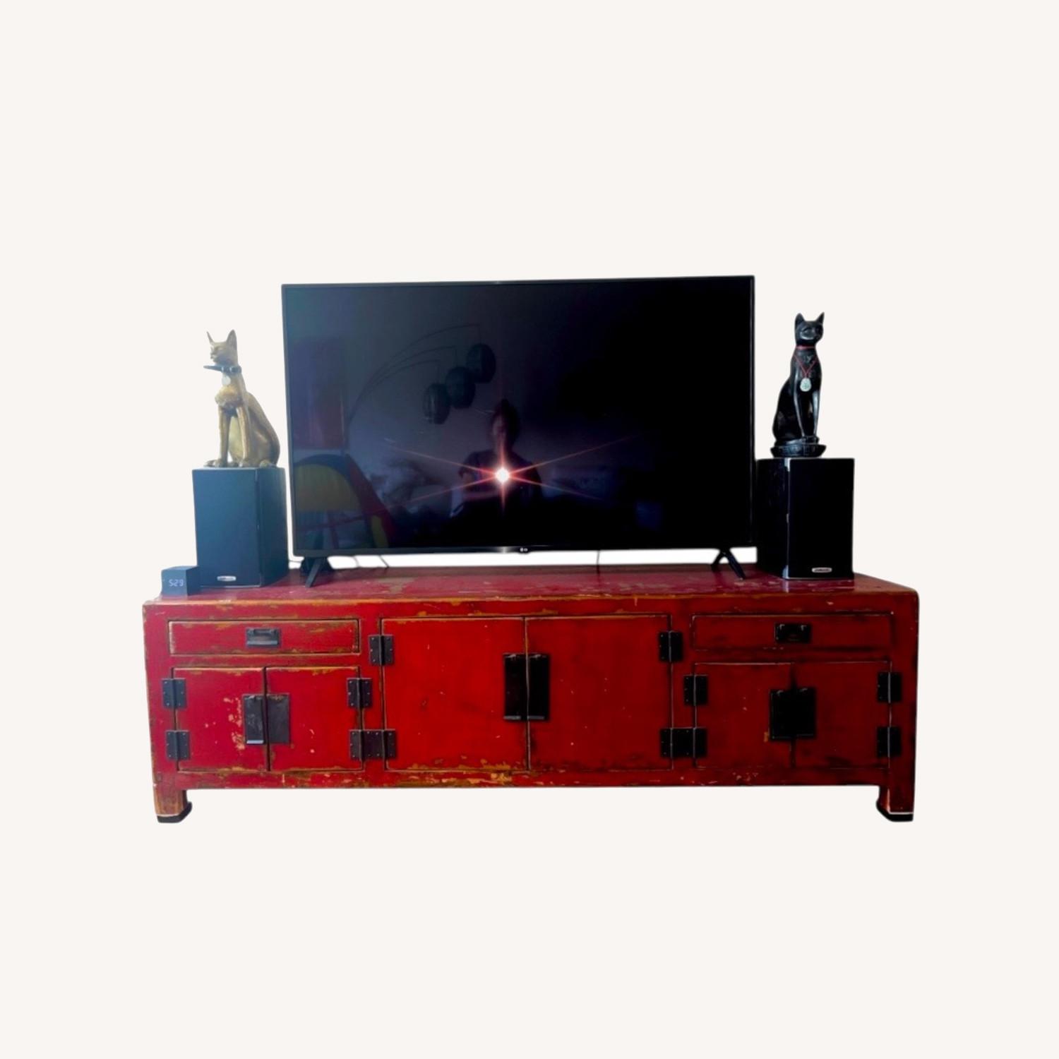 Seller's Notes:ABC Carpet & Home Asian antique-style media console / TV stand with three cabinet areas, 2 smaller drawers, and cutouts for wires at the back of each compartment. Mission style hardware/pulls (one missing). Cabinet doors swing open. Resembles an antique Chinese coffer. Painted in a vibrant red color and distressed for that worn, vintage look.