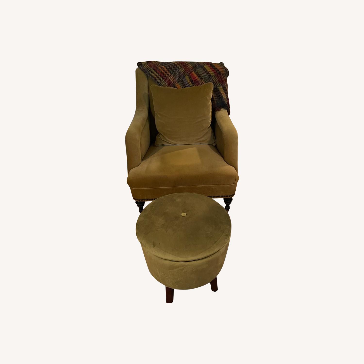Seller's Notes:Beautiful green very sturdy and beautiful armchair. Green ottoman is thrown in free. Can’t beat this armchair. Has some stylish details.