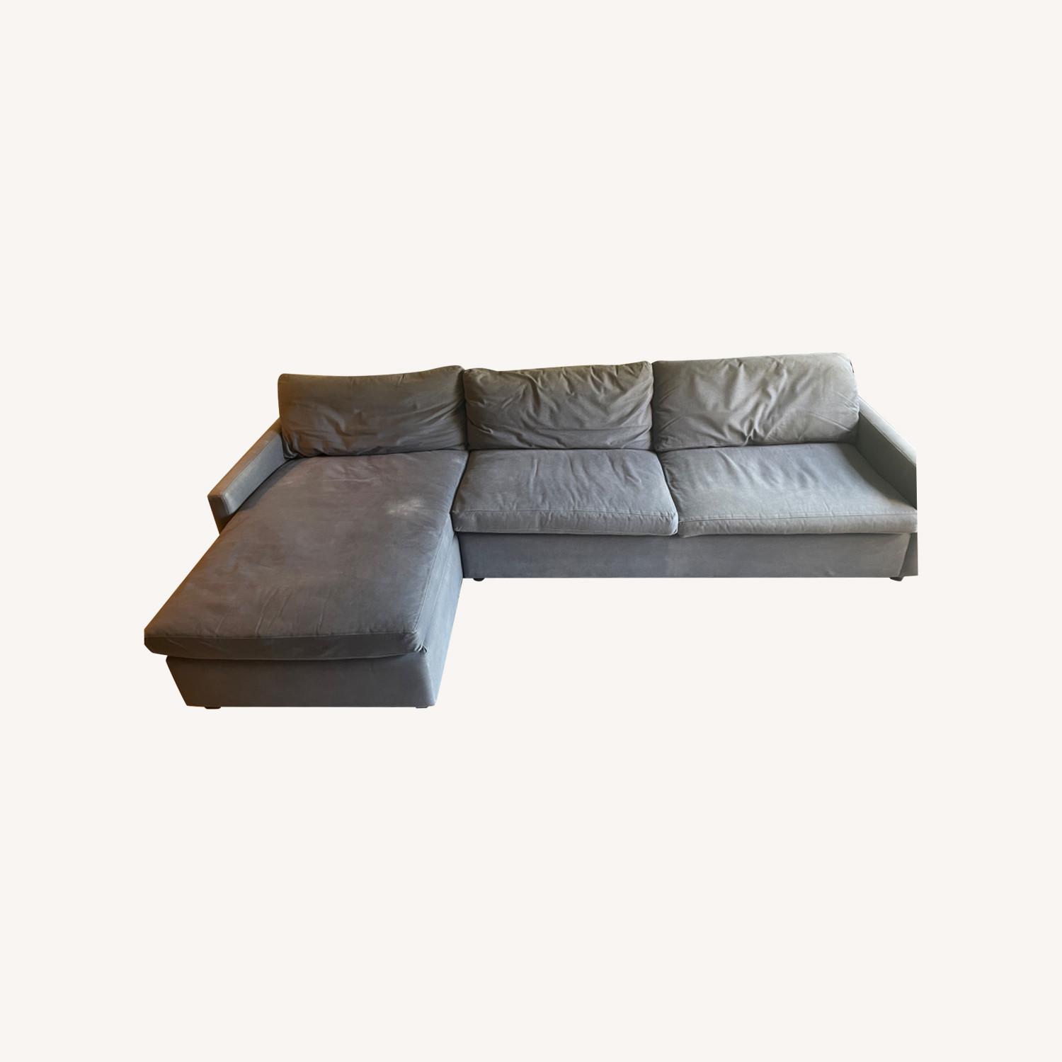 Seller's Notes:Purchased in 2016 at ABC Carpet & Home, this Cobble Hill sectional sofa with left-side chaise comes in a worn-in blue “twilight” denim material. Very comfortable and in excellent shape structurally, the fabric has some color fading due to sun exposure and stains on chaise where we tried to clean using chemical solution instead of water. Professionally cleaned winter 2023. Pet-free home. Can be moved as two separate pieces, 10 feet wide when all together, 5 feet 2 inches length for chaise, 37 inches deep for loveseat, 26 inches tall, love seat section 76 inches wide. Pick up from elevator building. There is one set of gradual stairs at building’s service entrance.