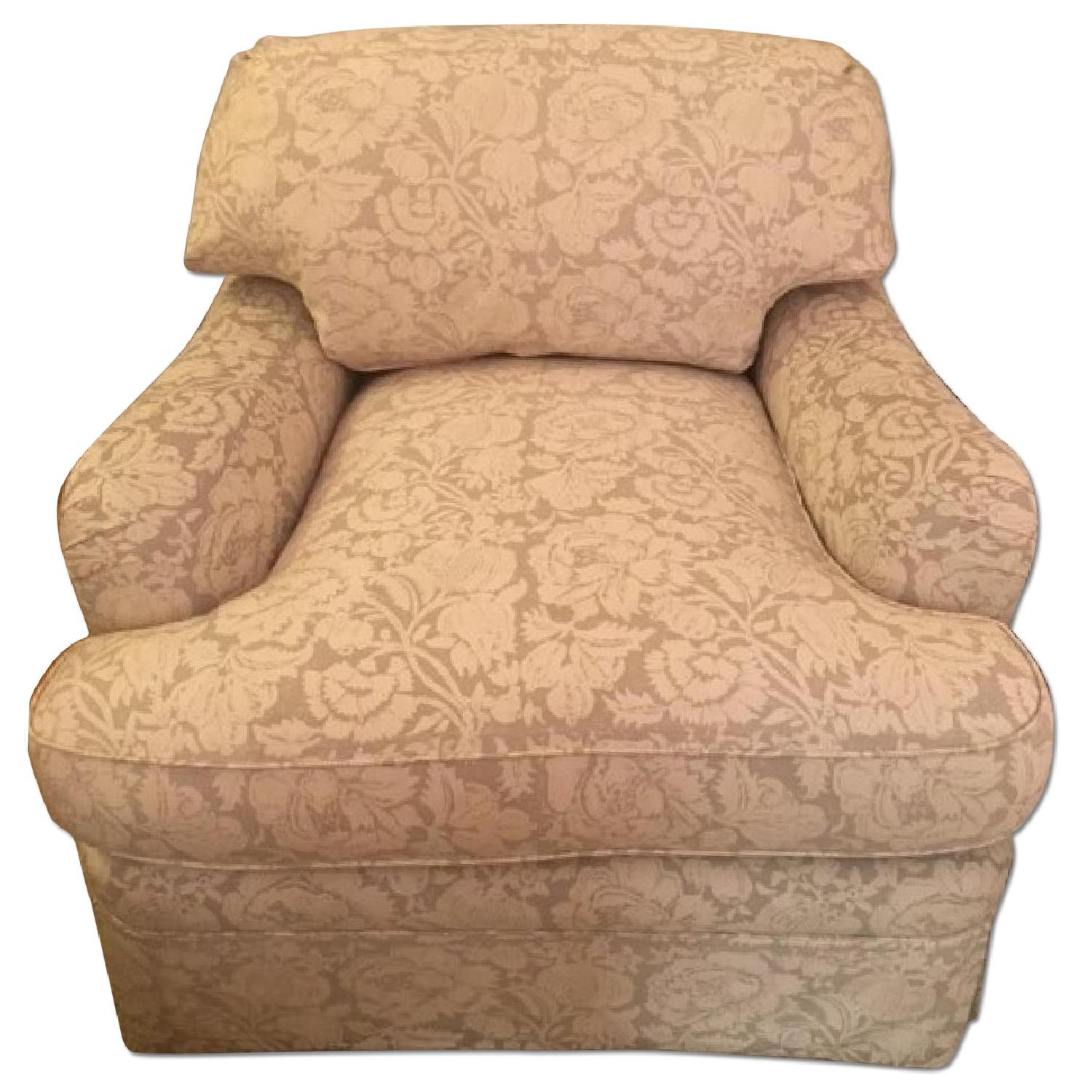 Seller's Notes:This is a beautiful and very comfortable lounge chair purchased at ABC Carpet & Home and reupholstered in Bennison All Over Floral Negative - Pale Grey on Oyster by Beckenstein (NYC-based upholsterer). Bennison fabrics run about $300/yard, so I'm basically selling the chair for the cost of one yard of the fabric. If I recall correctly, the chair cost about $1,750, and at 8 or 9 yards of fabric, the fabric cost $2,000-$3,000, then there was the cost of labor to reupholster... so I am underestimating the retail price. The seat cushion is foam and still very solid (the seat was hardly ever sat in), and the back cushion is down-filled (and also still very full). It is in excellent condition and looks like new except for a few light stains, shown in the last three photos: 1) underside of one of the seat cushions (you could keep it on the underside or have this professionally cleaned - the cover zips off), 2) left side of skirt of one of the chairs, 3) right side of same skirt (these are not noticeable since they are near to the floor, but you could have an upholstery cleaner try to remove the stains). I love this chair and am only selling because I am moving and completely redecorating, and sadly this chair will not be a fit in my new living room. I am posting an identical chair separately at a higher selling price as it has no visible stains.
