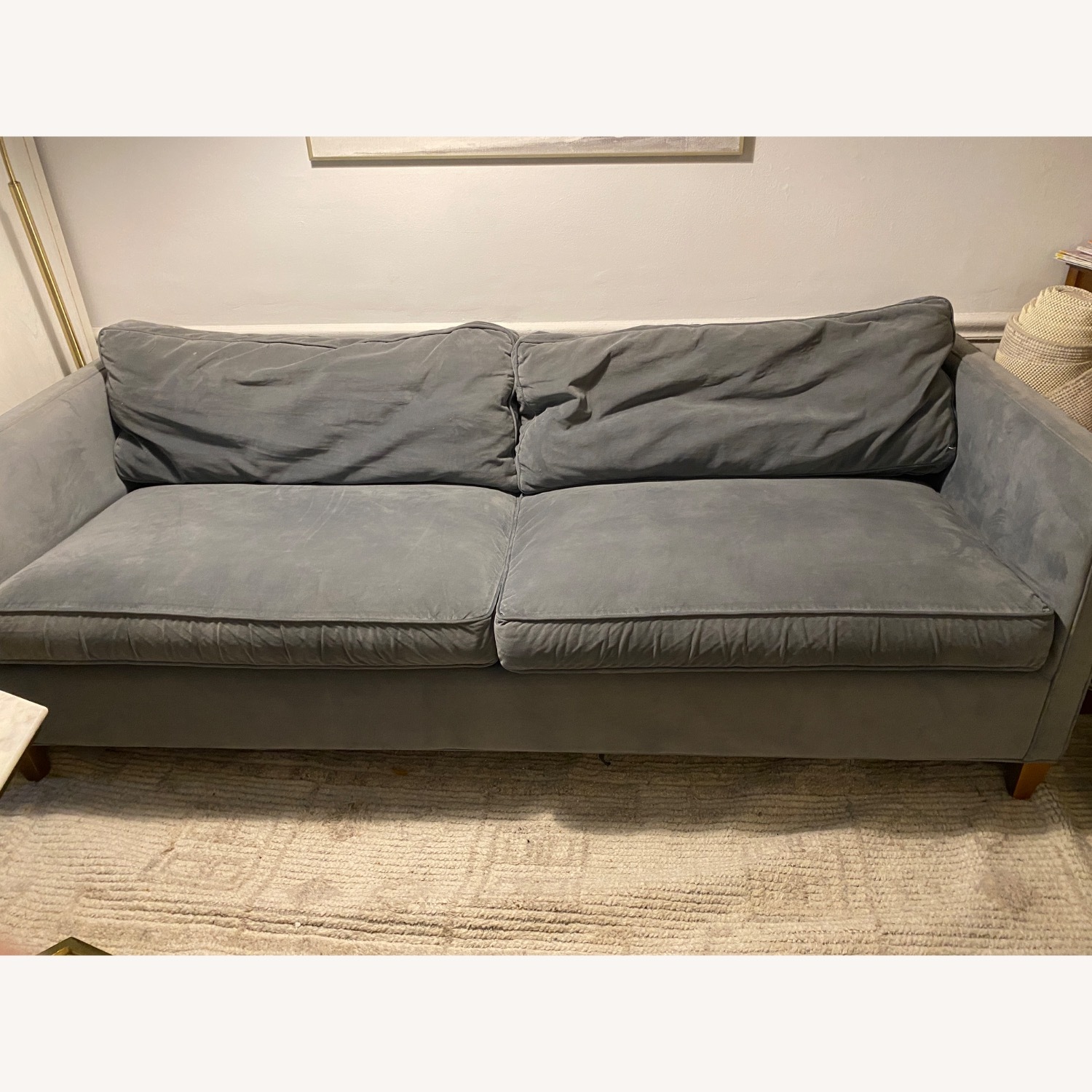 Seller's Notes:We've had this sofa for 11 years and it has held up unbelievably well! No sagging and the upholstery is all in great shape. Very easy to clean because of the dark gray velvet fabric. The back cushions could be puffed back up and there are some loose threads along the back cushion seam, but they don't seem to impact anything and could probably just be cut off. We need something larger now, which is the reason we're selling it.