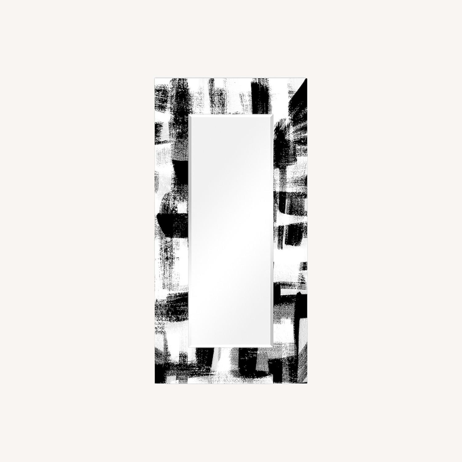 This stunning 72" x 36" frameless, free-floating tempered glass art is the perfect addition for any room where a 6 ft tall mirror is preferred. This specific mirror places a large rectangular mirror over beautiful abstract art of different shades and shapes of black. The mirror in the middle is 55"x 20" with a 0.7" beveled edge. 4 strong steel hangers are attached to the back of the mirror for quick and easy installation either vertically or horizontally.