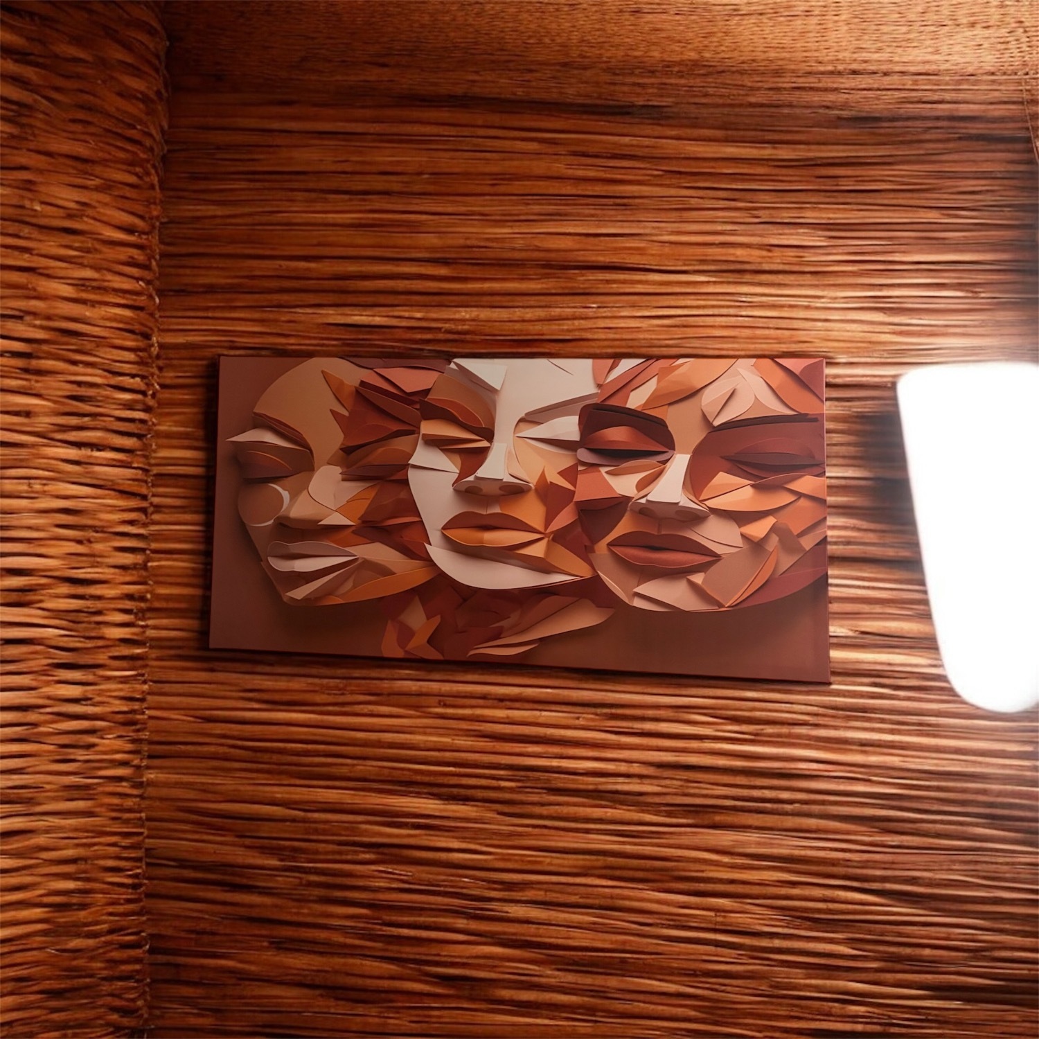 Transform your space with this stunning canvas wall art featuring a captivating abstract design. The piece showcases three intricately crafted faces, accentuated by a warm palette of earthy tones. Each layer and contour brings depth and texture, making it a striking focal point for any room.