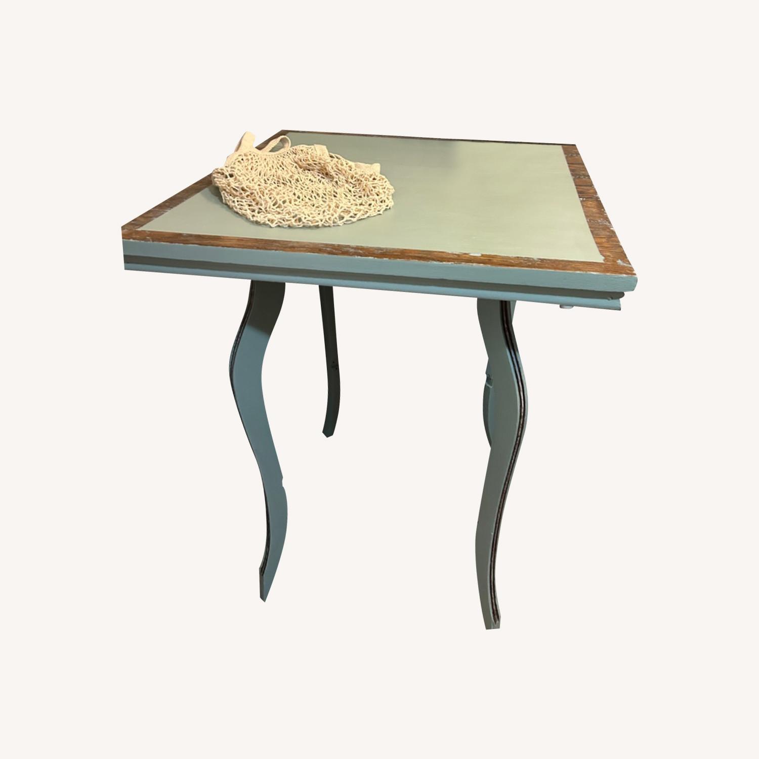 Seller's Notes:I purchased this table from a local boutique owner. She recently painted it “Unicorn” colored for her young daughter. I’ve sanded most of the table leaving the original corners exposed to show it’s history! It has a beautiful blue green(ocean green) with light and dark browns on the trim and legs.