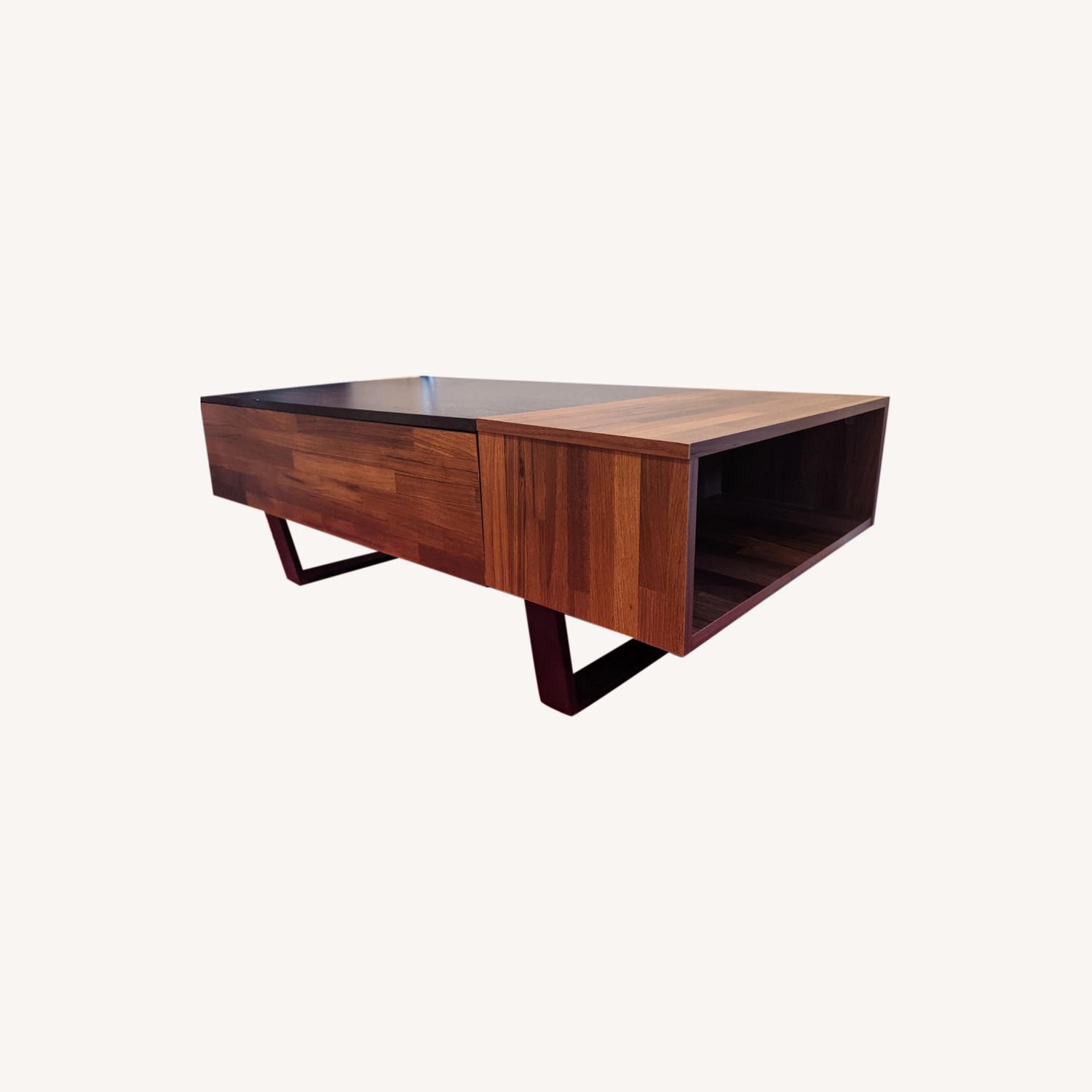 Seller's Notes:Nice low coffee table, purchased two years ago from ACME furniture (and no longer sold by the company.) It has one drawer and one cubby hole for hiding things away. It's in good shape - has a scratch and a chip on the top (pictured) but it's in the painted section and can be covered up easily. I've been using it as a low desk (while sitting on the floor) and it's worked out fabulously. All dimensions: Width: 47 inches Depth: 23.5 Height: 15.5 (7 inches of space underneath it.) Cubby - Inside depth: 22 inches Inside width: 11 Inside height: 7.25 Drawer - Inside depth: 13 inches Inside Width: 33 Inside height: 6