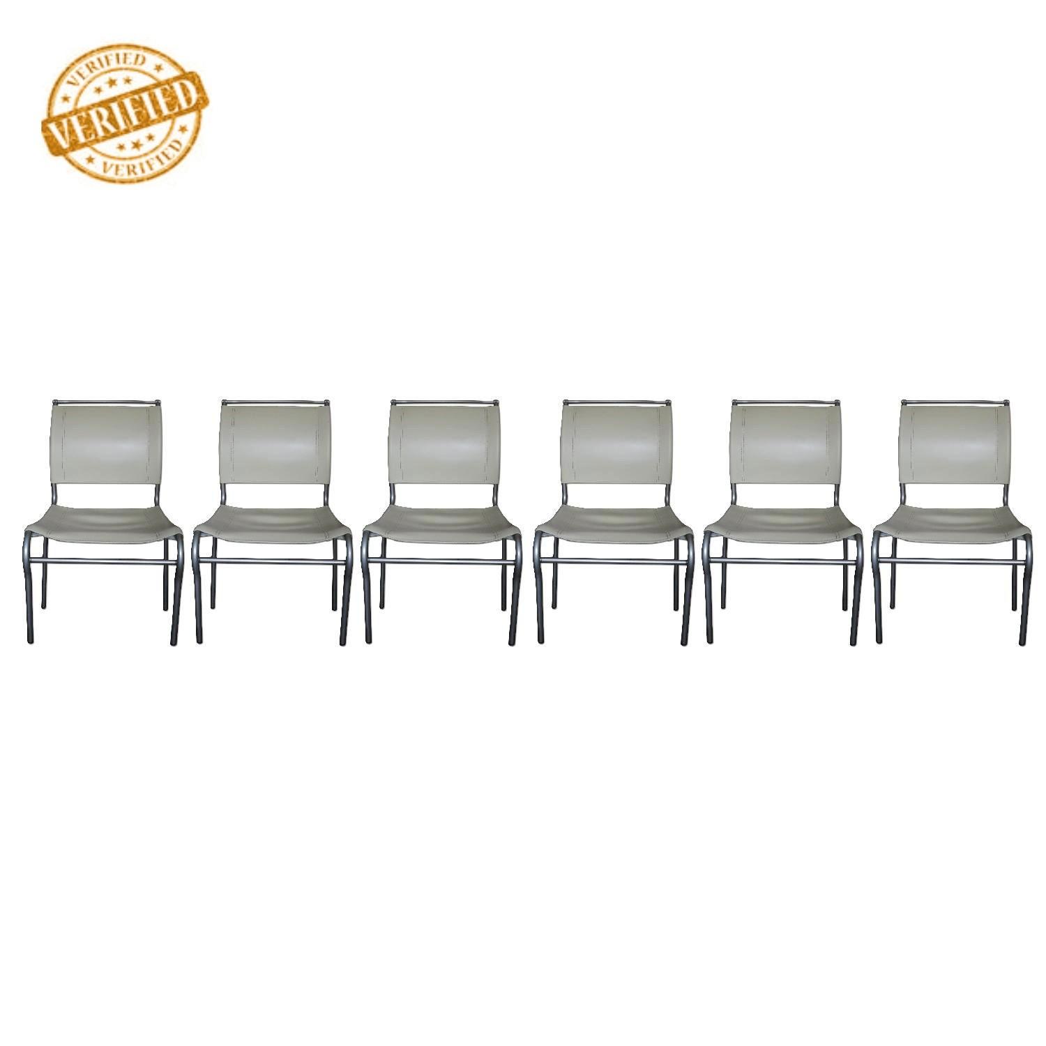 Seller's Notes:This item has been verified in person by AptDeco for accuracy & authenticity: White leather Calligaris dining chairs - set of 6. Satin finished steel frame.