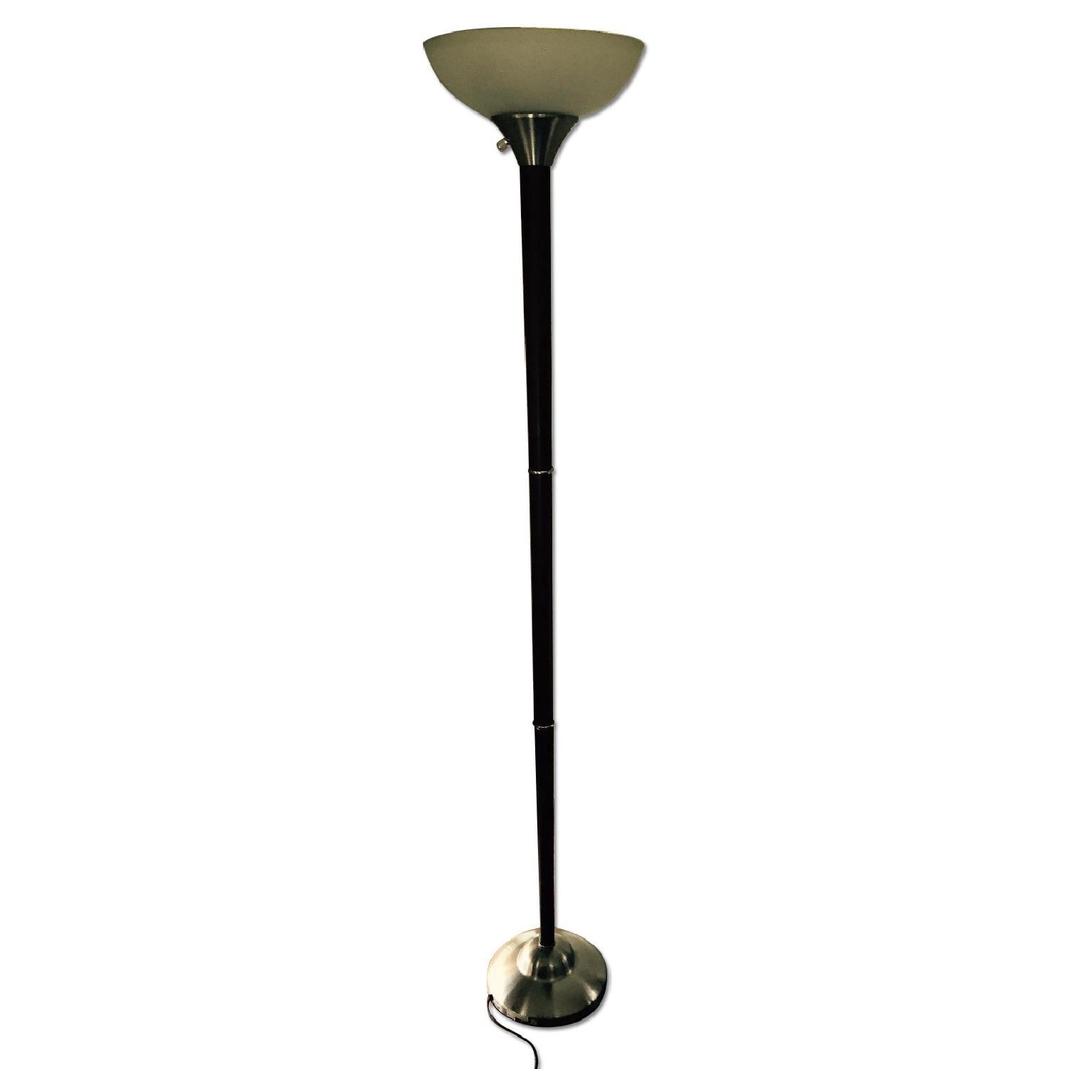 Seller's Notes:Nickel base, wood column and frosted glass shade. This lamp blends seamlessly into most spaces with it's simple and elegant look. The lamp takes 2 150 Watt bulbs, providing great light. Also has a three-way rotary socket switch for two brightness settings. Base is 10" in diameter. Lamp shade is 13.75" in diameter.