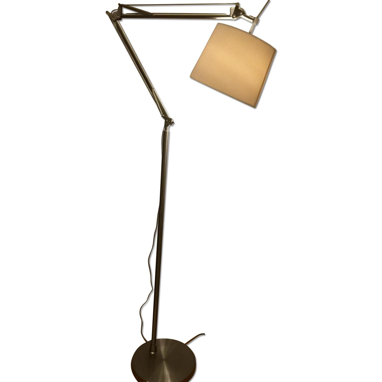 Seller's Notes:Used in our home for approximately 2 years. This architect floor lamp from Adesso Lighting is offered in a satin steel finish. Satin steel with heavy round weighted base and finely pleated natural fabric shade. Line switch. Depth: 26" to 36". The shade adjusts vertically with a long stick wand. Base: 12½ inches Height: 7 feet 1 inch Projection: 36 inches Shade Bottom: 12 inches Shade Height: 9 inches Shade Top: 10 inches