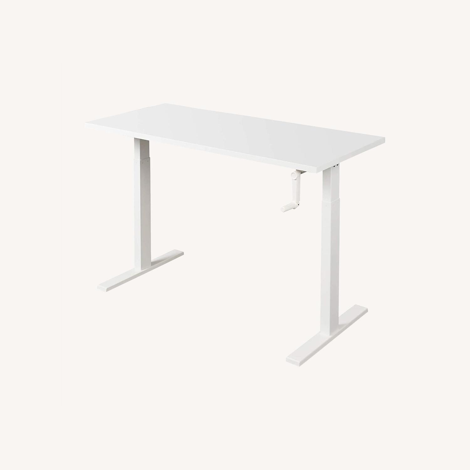 Seller's Notes:Hi, I'm moving overseas and looking to sell this desk. About a year old. No damage, just some minor scratches. Works well - crank handle so no issue with motor issues. Fits 2 monitors easily Fully assembled Desk design Computer Desk Product Dimensions 23.6"D x 55"W x 45.5"H Color White Room Type Office Shape Rectangular Brand DEVAISE Top Material Type Engineered Wood Mounting Type Floor Mount Assembly Required Yes Item Weight 47.4 Pounds ERGONOMIC DESIGN: The innovative adjustable height standing desk promotes better posture, reduce back and neck pain, a thinner waist line and increased productivity. EASY CRANK SYSTEM: Standing desk is designed with a hand crank that be placed on the front of desktop. Load up your desk with all of your office essentials and simply turn the crank to raise and lower the desk to your desired height! Adjustable height from 29.5" to 45.5". SPACIOUS WORKSPACE: 55.1" W x 23.6" D of standing computer desk workstation provides large area for 2 monitors at a comfortable position. STABLE: This standing desk workstaion is made of heavy duty frame ensures years of use. Weight capacity up to 100 lbs.