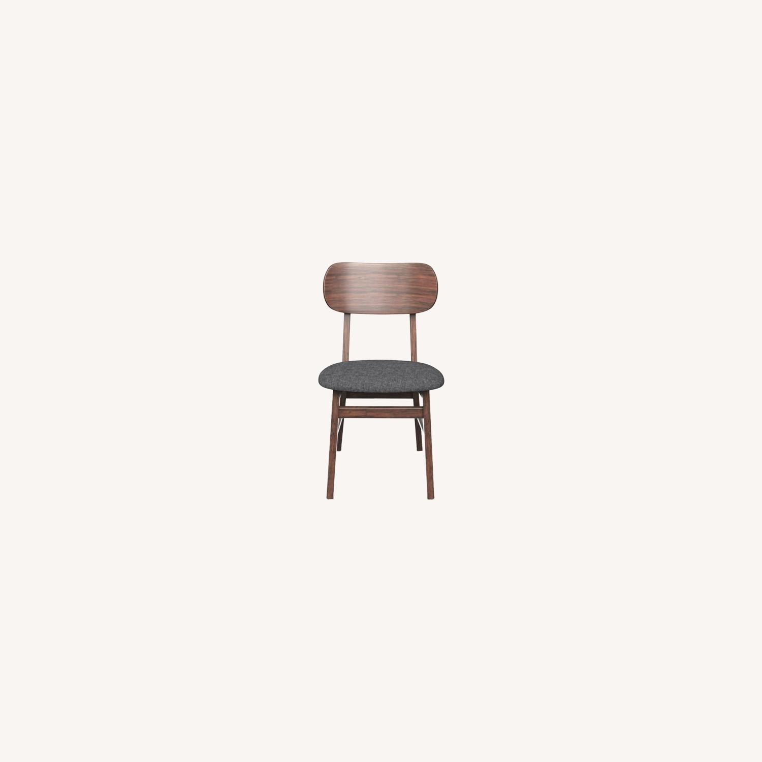 Seller's Notes:Crafted from solid wood stained a warm walnut color, these chairs have a slightly curved back for added comfort. Its seat cushion is upholstered in a neutral grey fabric which works well in a variety of settings.