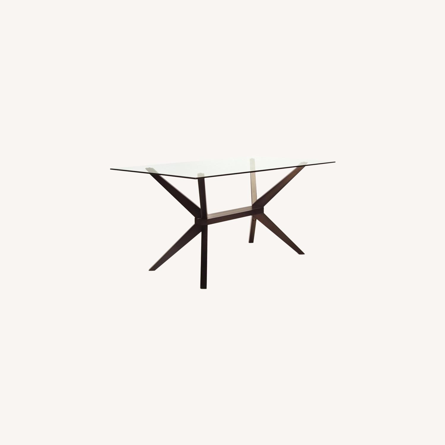 Seller's Notes:The clear rectangular tempered glass table top (10mm) rests on a stylish angular designed solid beech wood base with a coffee stain finish and aluminum center trim.