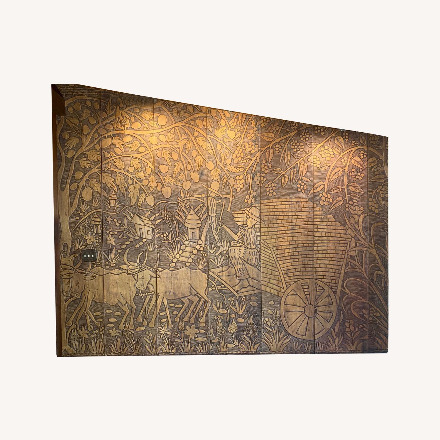 Seller's Notes:Beautiful hand carved wood bas-relief mural. Most likely of African origin. Assembles as panels. Can be cut to size to fit. Switch plate hole has been cut out on first panel; see photo. 147.25” Width x 123.5” max height L 97” min height R 8 panels 1 panel = 19.5” 2 panel= 23.5” 3 panel = 23.5” 4 panel 23.5” 5 panel 23.5” 6 panel = 6.875” 7 panel = 17.25” 8 panel = 9.25”
