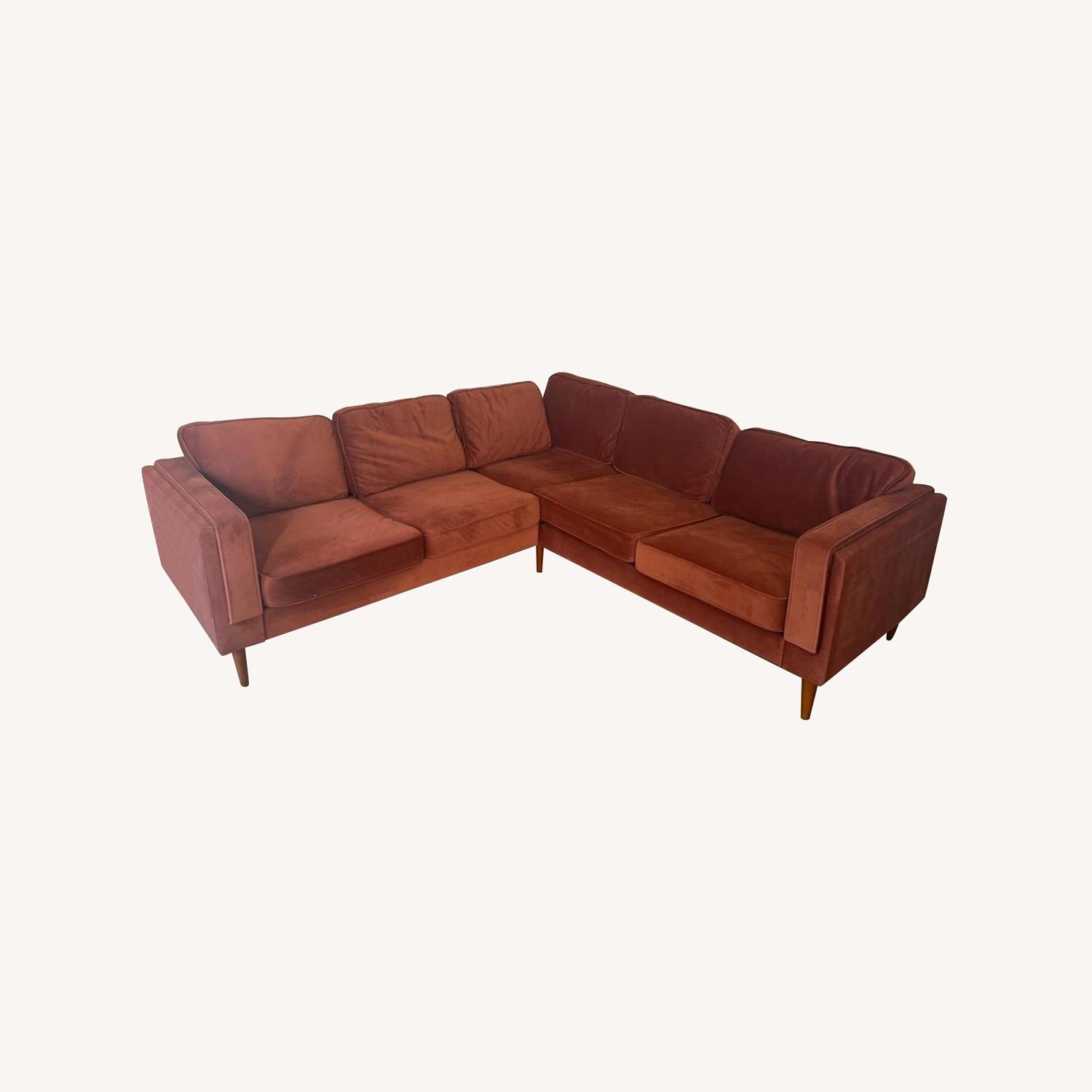 Seller's Notes:Gorgeous, comfortable, durable, high-quality Albany Park corner sectional in rust velvet with walnut legs. Nine months old; large and luxurious. In near-perfect condition. We're getting an even larger sofa to accommodate our growing family. Exposed to one cat.
