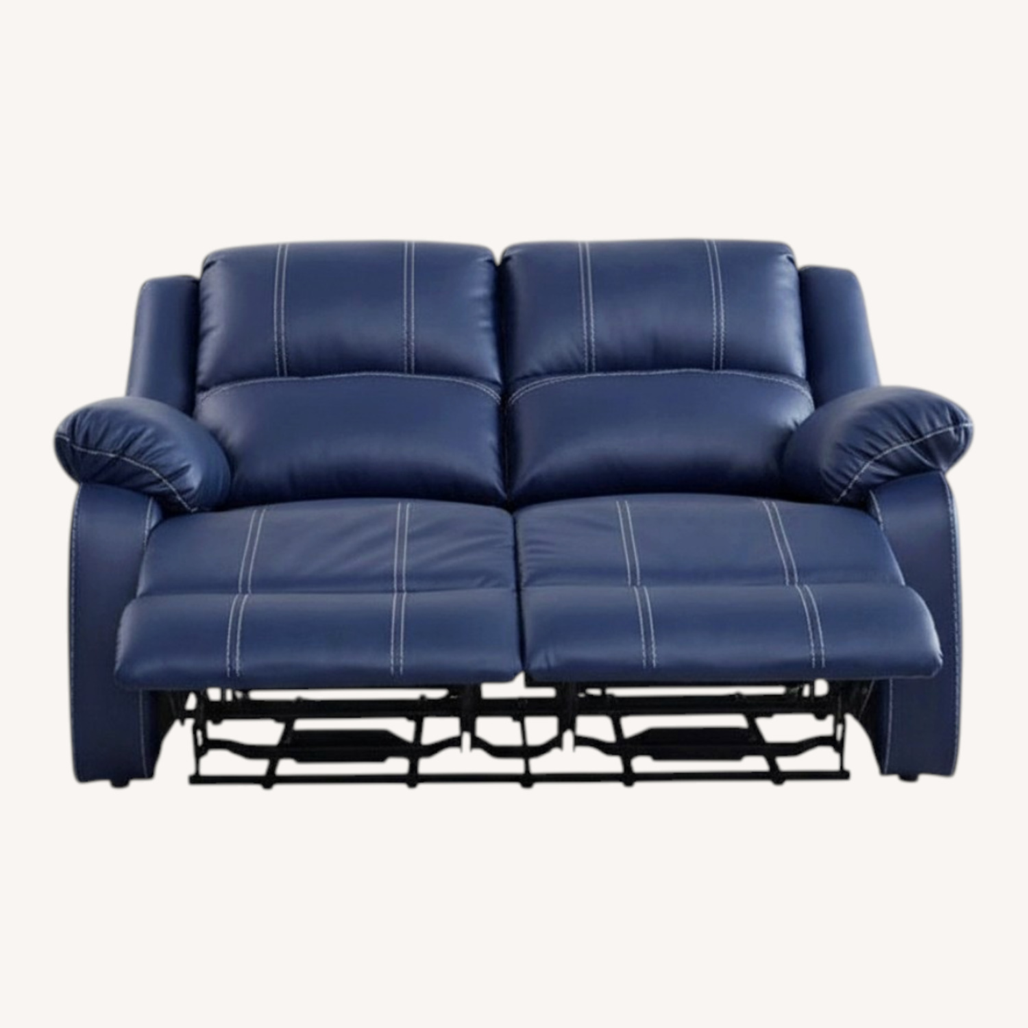 Seller's Notes:Lightly used navy leather loveseat. It's really beautiful. I've gotten a lot of compliments on the color and functionality. We're moving and this piece is too heavy for us to move. It's a 2 person reclining loveseat. It reclines with motorized buttons/control with the back reclining and legs raised. The control is on each side of the loveseat with a USB port too, very handy! Pillow top armrests make this even more comfy. Navy blue leather with contrasting white stitching.