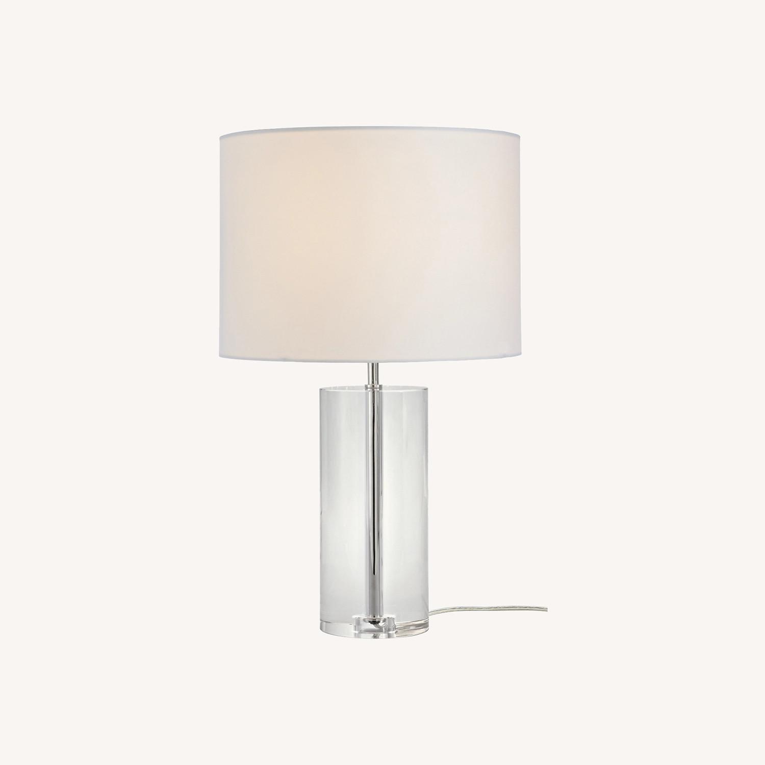 Seller's Notes:The lamp was purchased at Room and Board 4 years ago. It has a solid 2.4 inch diameter/ 18 inch tall clear glass column. The base is stainless steel and a little short of 7 inches in diameter. The shade is 18 inch in diameter and was replaced six months ago.