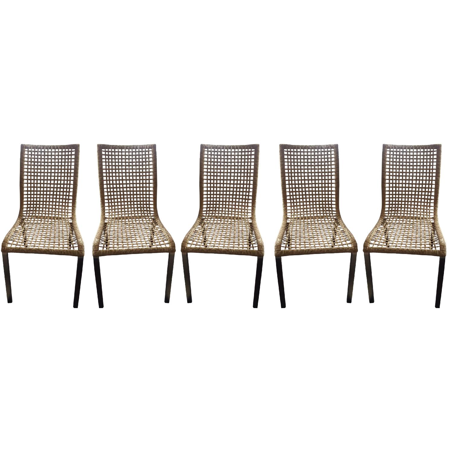 Seller's Notes:5 modern dining, kitchen, or office chairs purchased from All Modern. Woven rattan-like seat and back with brushed metal legs. All 5 are armless. They are less than a year old and hardly ever used. One has a few places where the weaving is coming slightly uncoiled on the side where it wraps around the base of the seat but it's not very noticeable. No stains. Only selling because need to downsize a bit.