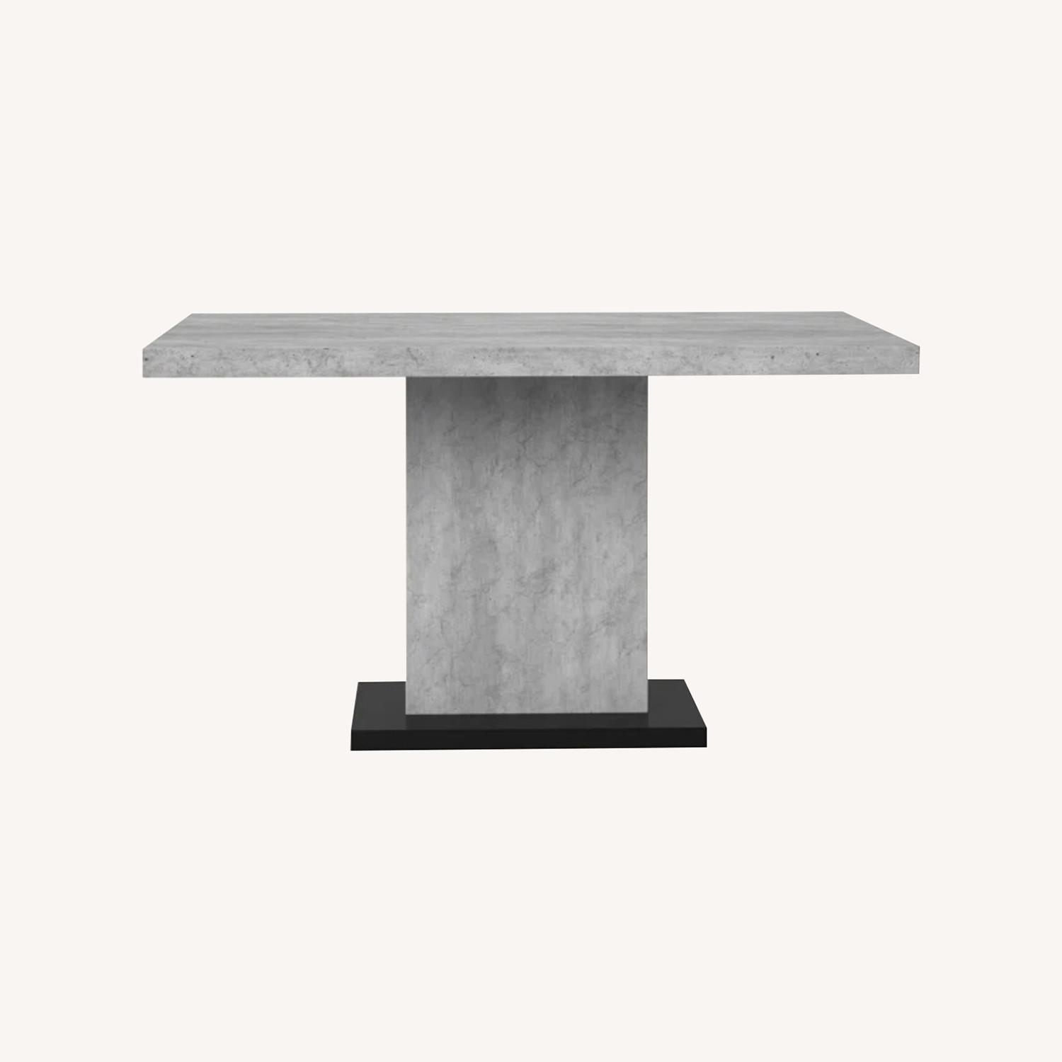 This clean-lined dining table delivers impactful modern style to your dining room. It's made of engineered wood with a powder-coated iron base in a black, glossy finish. This dining table features a sleek silhouette with a rectangular table top on a block-like pedestal base made of two panels connected to a black base. A gray faux-stone finish gives this table a rustic appeal with a concrete-like look that makes a statement. We love that this table can sit four people, just right for weekend brunch with friends or intimate evening dinners.