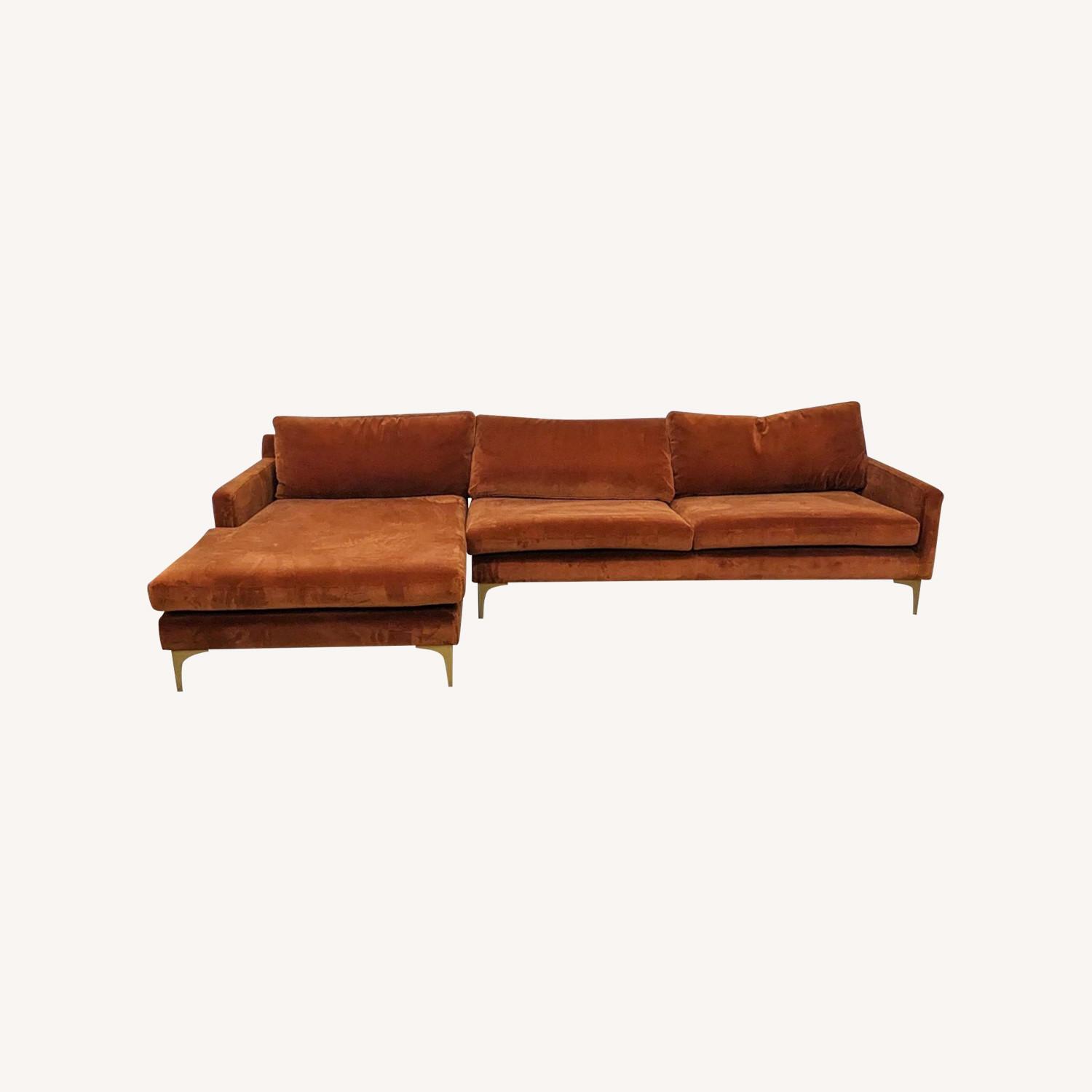 Seller's Notes:Description: Low Profile Modern Rust Fabric Upholstered Vincent Sectional With Narrow Arms And Matt Brass Steel Legs. Brand: All Modern. Seat heigt: 18. Retail price: $1706. Gently used - any blemishes or damage will be included in the photos. #SKU: 1058795. Tags: metal,fabric