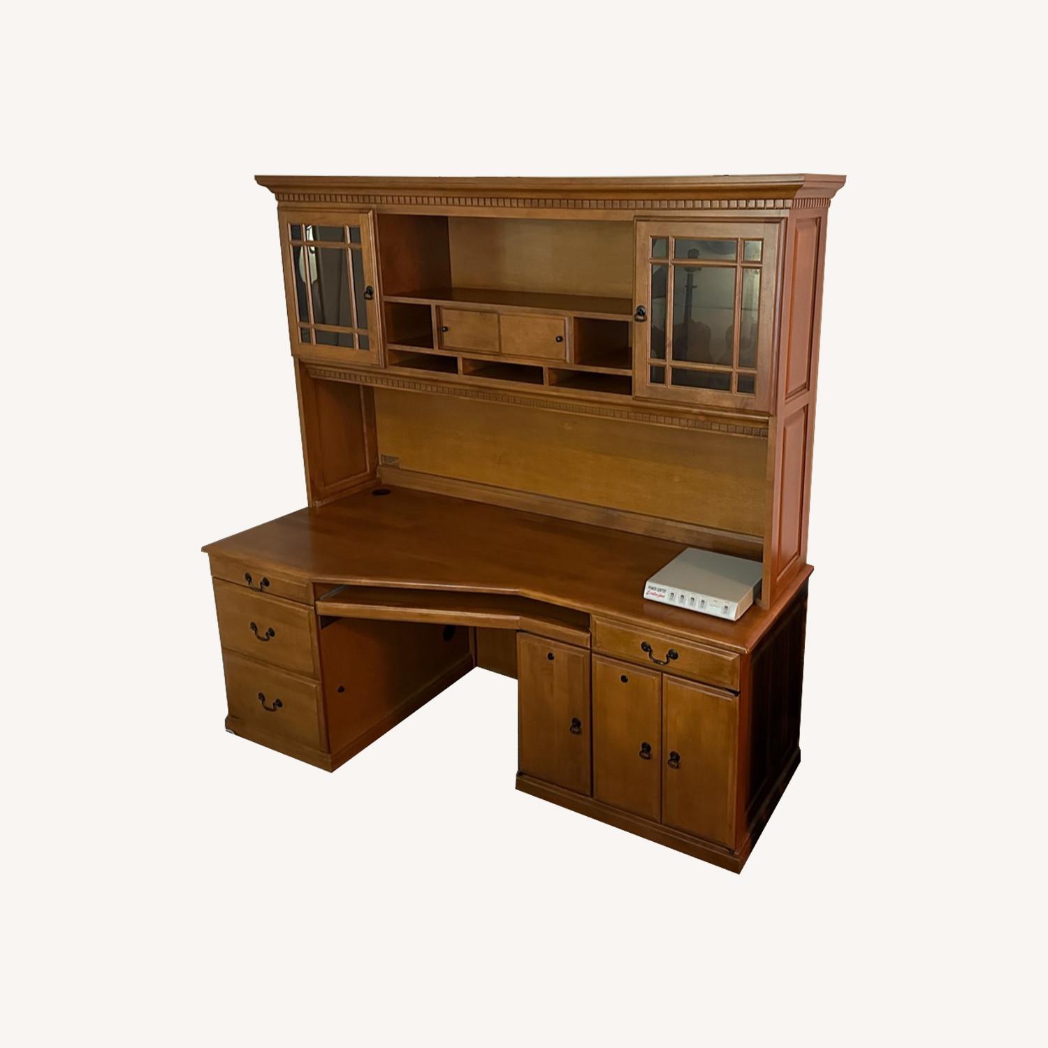 Seller's Notes:All wooden executive desk with hutch. Comes with 2 drawer solid wood filing cabinet that has locks on each drawer. Made in the USA and more sturdy than you can imagine. The Amish would be proud of this desk, in great shape. Looking for a nice home for this beautiful desk. Desk has 4 drawers and 2 cabinet doors, immense amount of space. Bottom left drawer has filing use and has a lock. desk also has keyboard drawer. Desk: L: 78” W: 26” & 35” H: 30” Hutch has 2 glass cabinet doors with glass shelves, each one has a light. Sliding divider in middle section. Hutch: L: 78” W: 15” H: 50” Filing Cabinet: L: 24.5” W: 21.5” H: 30” Desk and hutch are two separate pieces. Both are EXTREMELY HEAVY. You will need very strong people to move these pieces of furniture. Recommend bringing a truck and moving equipment, dolly, etc. If you pay extra I will lend you my arms.