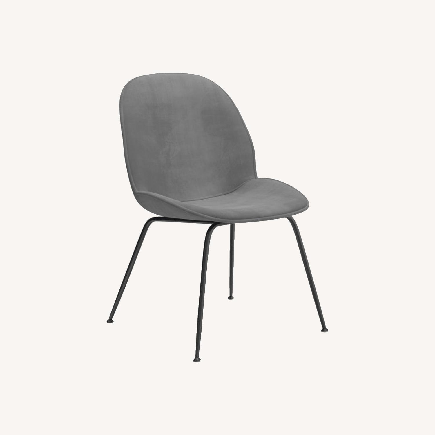 Seller's Notes:Pair (2) of upholstered Amelie velvet side chairs in platinum gray from All Modern. These are designed in the style of the Gubi beetle chair. These are brand new and have not been fully assembled yet. I only took one of the chairs out of the packaging and decided these weren’t the right style or color for what I was looking for. Also one of the seats came with a small (very faint) stain on it (pictured with chapstick for scale) I received a partial refund from All Modern and hoping to just recover the rest.