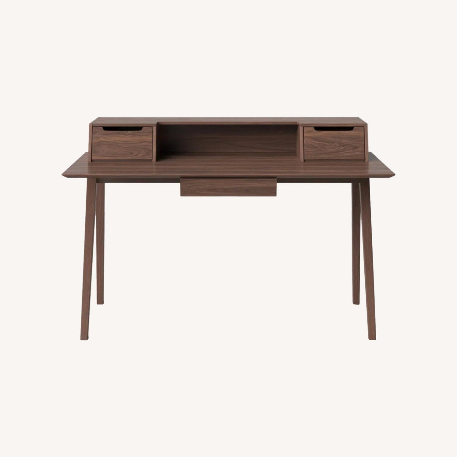 Seller's Notes:Inspired by mid-century modern style, this writing desk pairs a streamlined silhouette with warm, flowing wood grains. Three drawers and a small hutch offer space for papers + office supplies, keeping the desktop clear for work. Cable management cutouts organize cords, while tapered legs round out the elevated retro look. Brand new in boxes. Not assembled. There were issues with the shipping and I ended up using another desk. Product Type Writing Desk Overall Shape Rectangle Modular No Desktop Color Brown Top Material Solid + Manufactured Wood Base Color Brown Base Material Solid Wood Drawers Included Yes Number of Drawers 3 Wheels / Casters Included No Plug-In No Cable Management Yes Foldable No Weight Capacity 300 lb.