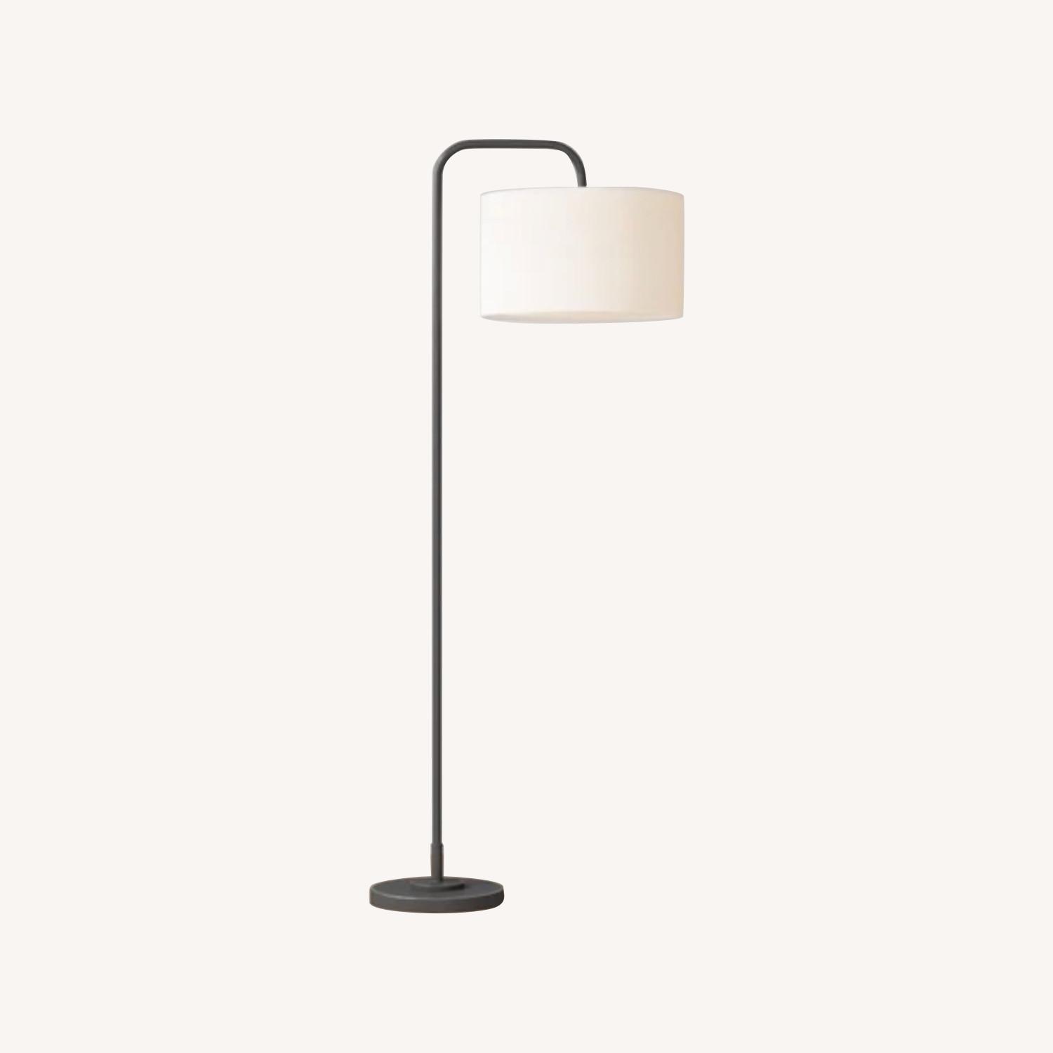Seller's Notes:Sleek lamp pairs with a streamlined design with retro inspiration. It is made from a metal round base and has. straight body that ends with a right angle arm for a clean look. It is powered by a floor switch. No sign of wear or tear.