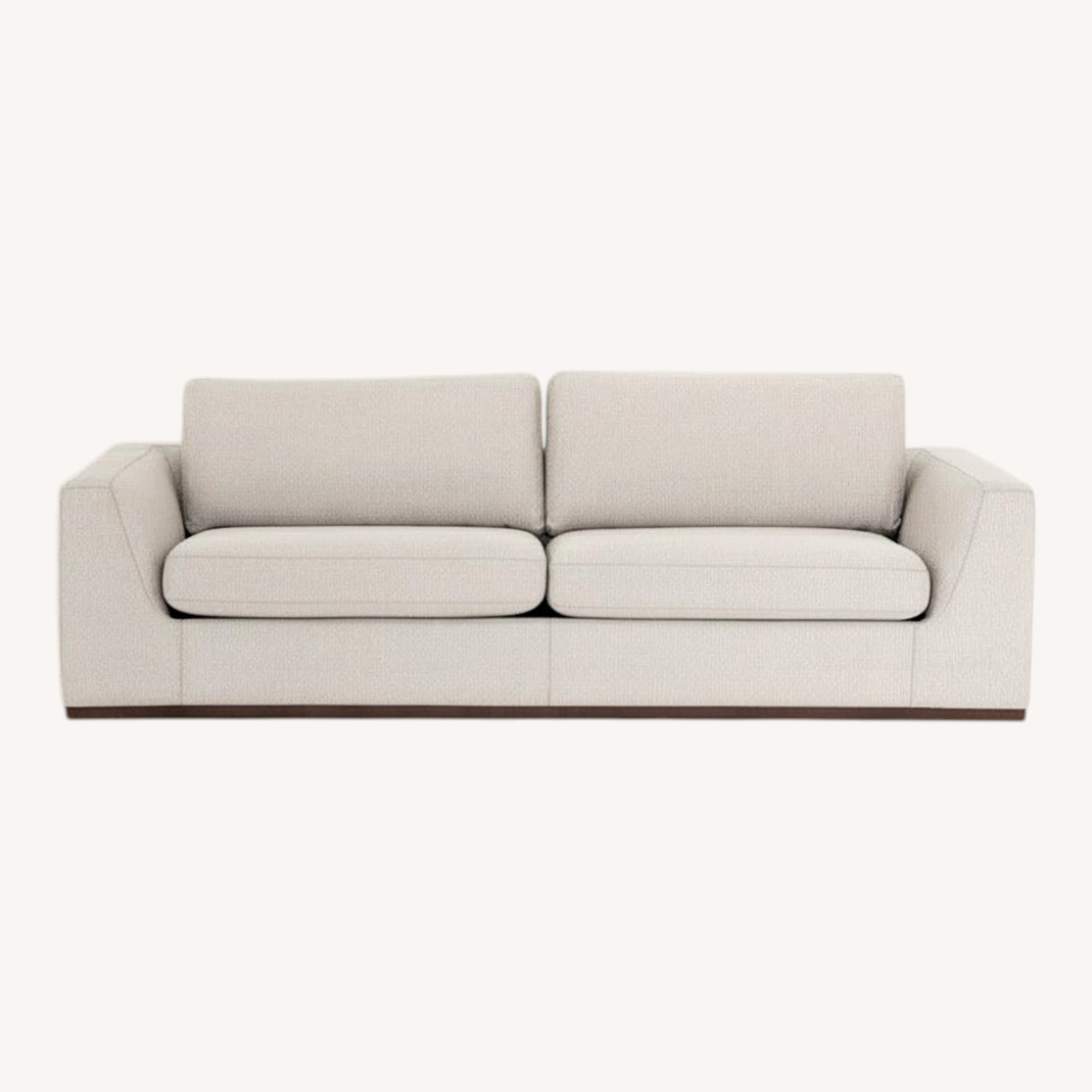 This sofa is designed with a clean-lined minimalism that puts the focus on the most important thing: Casual, everyday lounging. It's made with a solid wood frame that's wrapped in a textured polyester blend upholstery. Plus, the upholstery's neutral hue makes it super easy to match, or to use as the stage for some pops of color. Foam and synthetic fiber filling make up the removable seat and back cushions, so you can kick back with plenty of extra padding. Plus, with flared arms, a block base, and exposed stitch detail, it anchors your living room with simple minimalism. This sofa requires 29'' of doorway clearance, and arrives fully assembled.