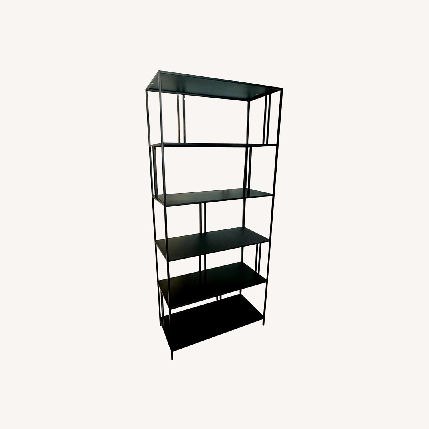 Seller's Notes:An assembled modern etagere black metal bookcase. Save the trouble of assembly! This bookcase has an open modern design that can compliment most apartments. The black finished metal accentuate a modest sense of luxury. It is sturdy and strong even with the airy flairy. Textbook on the top shelf will not make it shake. It has a quality build. Perfect for art, sculpture, sccent lamps, or like me, textbooks. Just the bookshelf is being sold.
