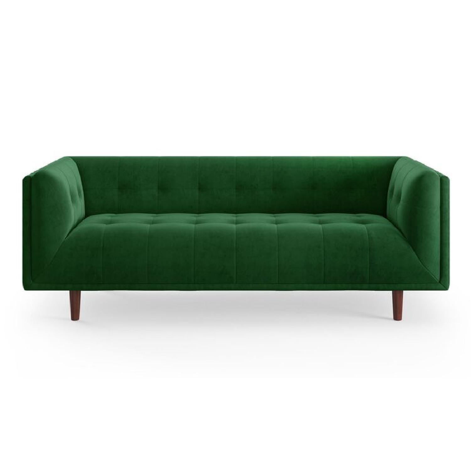 Seller's Notes:My girlfriend bought this couch right before I moved in with her. I brought a couch into our apartment. Now we have two. We're listing both and letting that determine which we keep. Of the two, this is the one that we almost never use. It looks like new, I am not aware of a single blemish anywhere on it—if you think you see one in the photo it's just because the velvet can be pushed around and photographs a bit strangely. A gorgeous piece with nice tufting. Plus, the single-large-cushion style makes it low-key a great sleep-over couch, despite looking quite grown up.