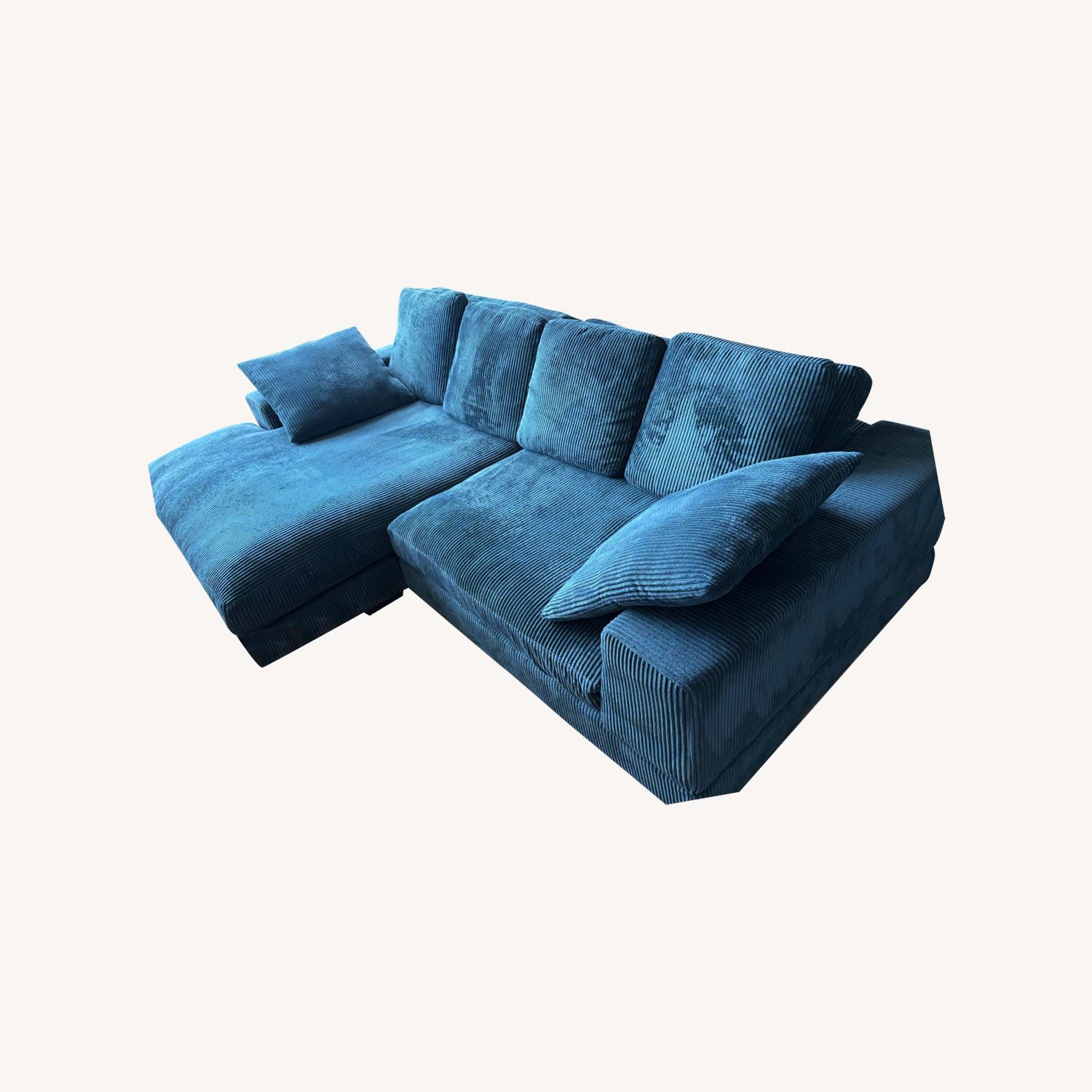 Seller's Notes:I've had this sectional for 3 years and it has served me well. I think it is perfect for a theater room or a lounge space as it is low profile and deep. This modern L-shaped sectional offers a cozy spot to relax and unwind. Wrapped in textured fabric, this sofa adds dimension + warmth to your space. The reversible chaise lets you customize your lounging experience, while the square arms provide a spot for your favorite snacks. And don't worry about snack mishaps – the removable cushion covers make cleaning a breeze. Four pillows make up the back + two extra accent pillows provide a plush feel for seating four.