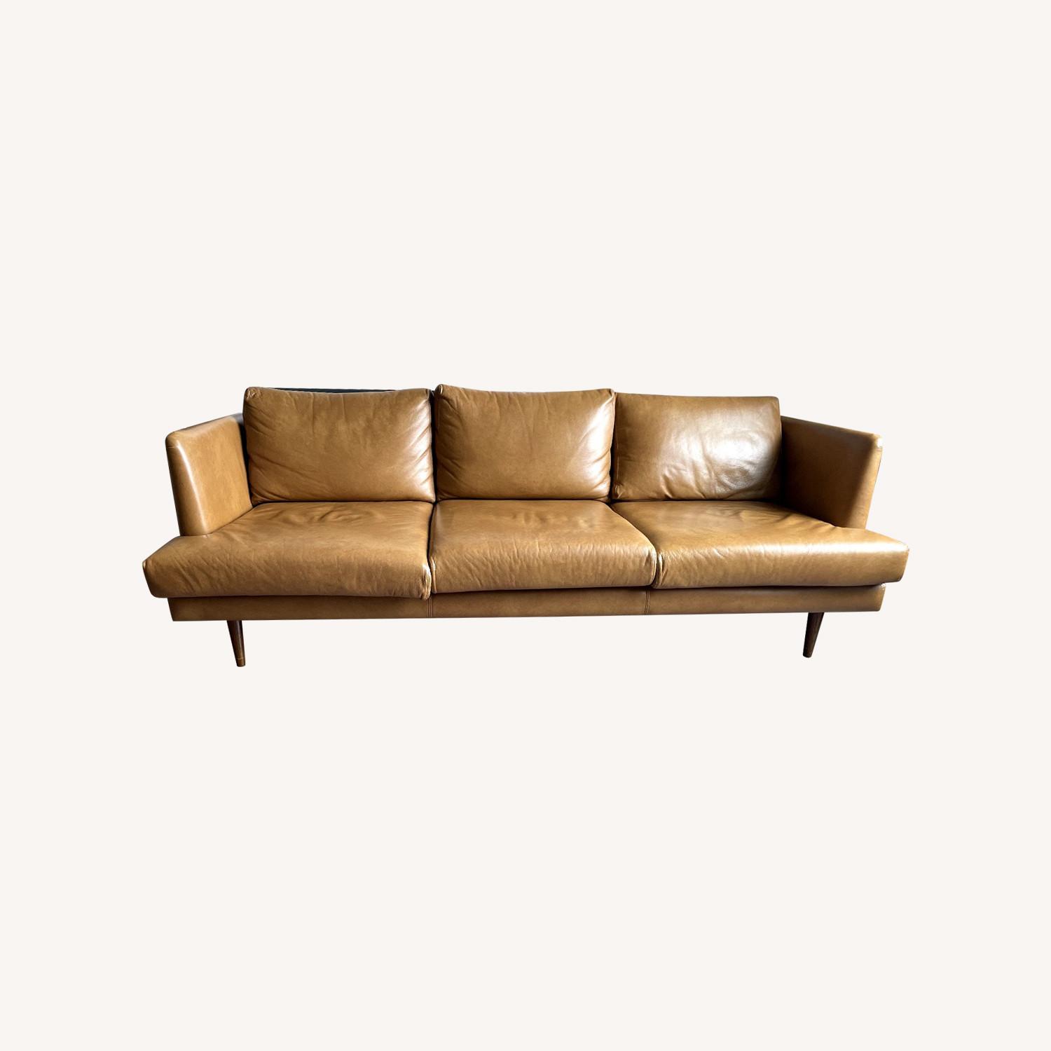 Effortlessly inviting. With a bold, streamlined silhouette that includes the tapering lines of its track arms + dowel legs, this sofa draws inspiration from mid-century Scandi style. It has a sturdy solid wood frame, and it’s upholstered in low-maintenance genuine leather in a rich caramel hue. The seat + back cushions are packed with foam for lots of support as you stretch out and relax.
