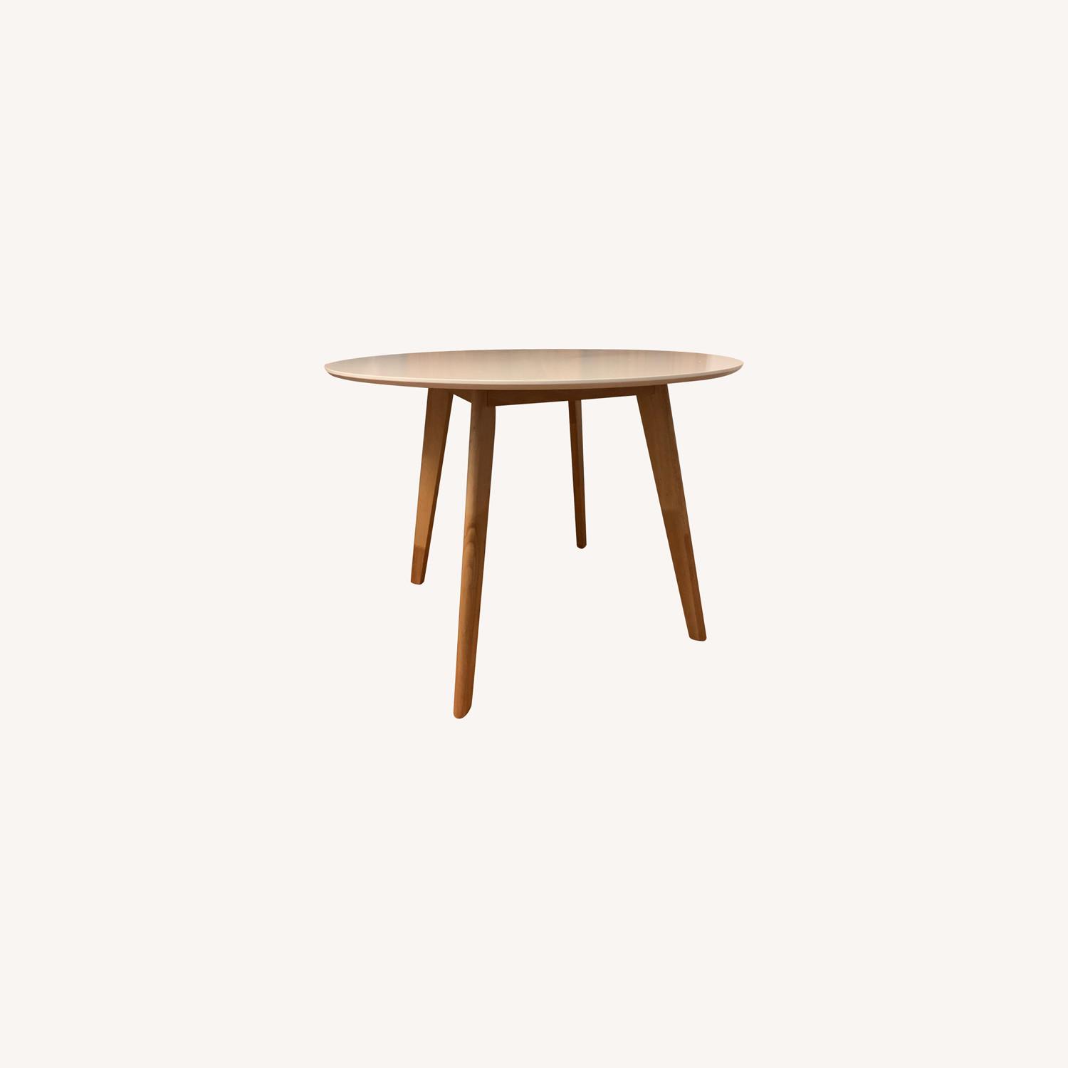 Seller's Notes:We love this table, but are moving and can't bring it with us! The circular tabletop is made from engineered wood and has a 42" diameter making it a perfect fit for a dinner of four. The tapered legs are made from solid rubberwood and slightly flare outwards for a mid-century modern look. Overall Dimensions: 42'' L x 42'' W x 29.53'' H Legs - 29.5'' H Overall Product Weight - 41.8 lb.