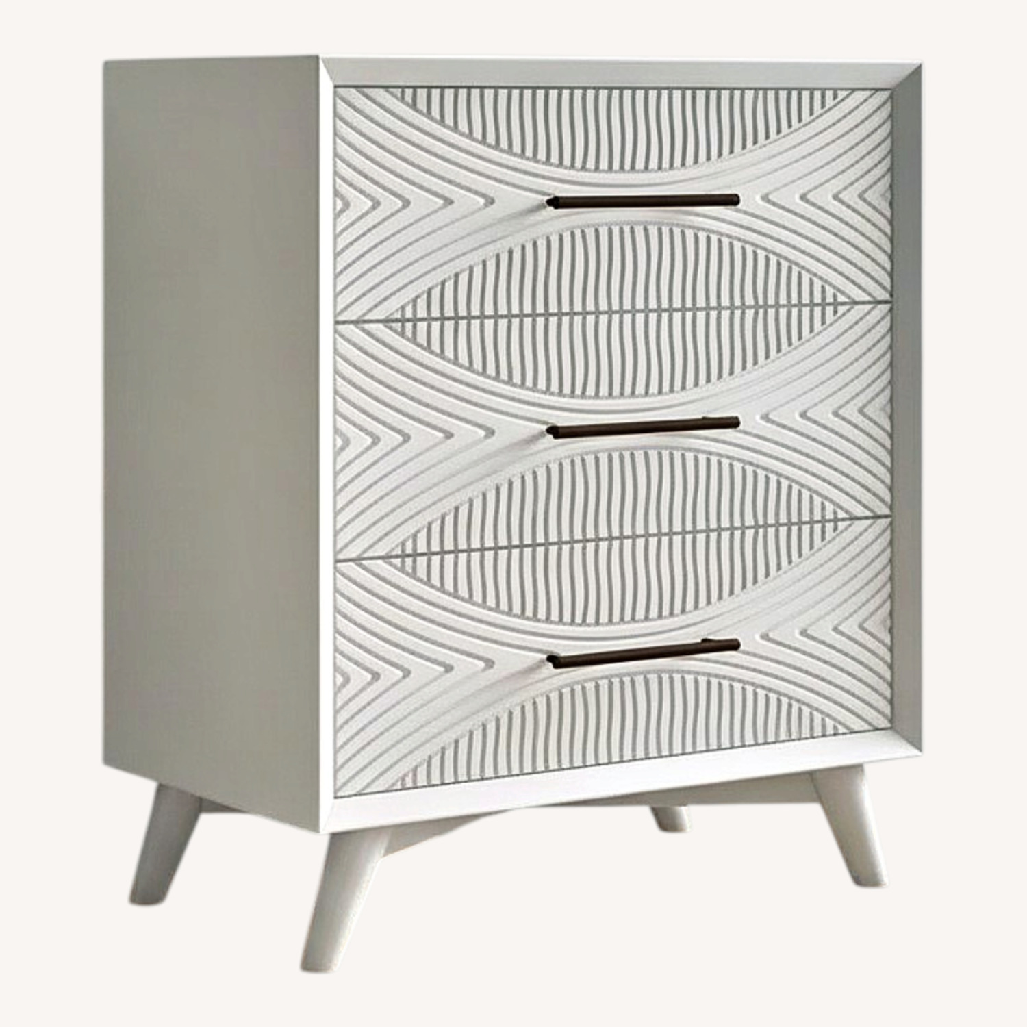 This dresser’s curvilinear carved design adds softness + dimension to its tidy retro silhouette. The crisp white finish fits right into minimalist spaces, or serves as a clean backdrop for colorful accents. Three drawers with durable dovetail joints hold shirts + socks. Arrives fully assembled.
