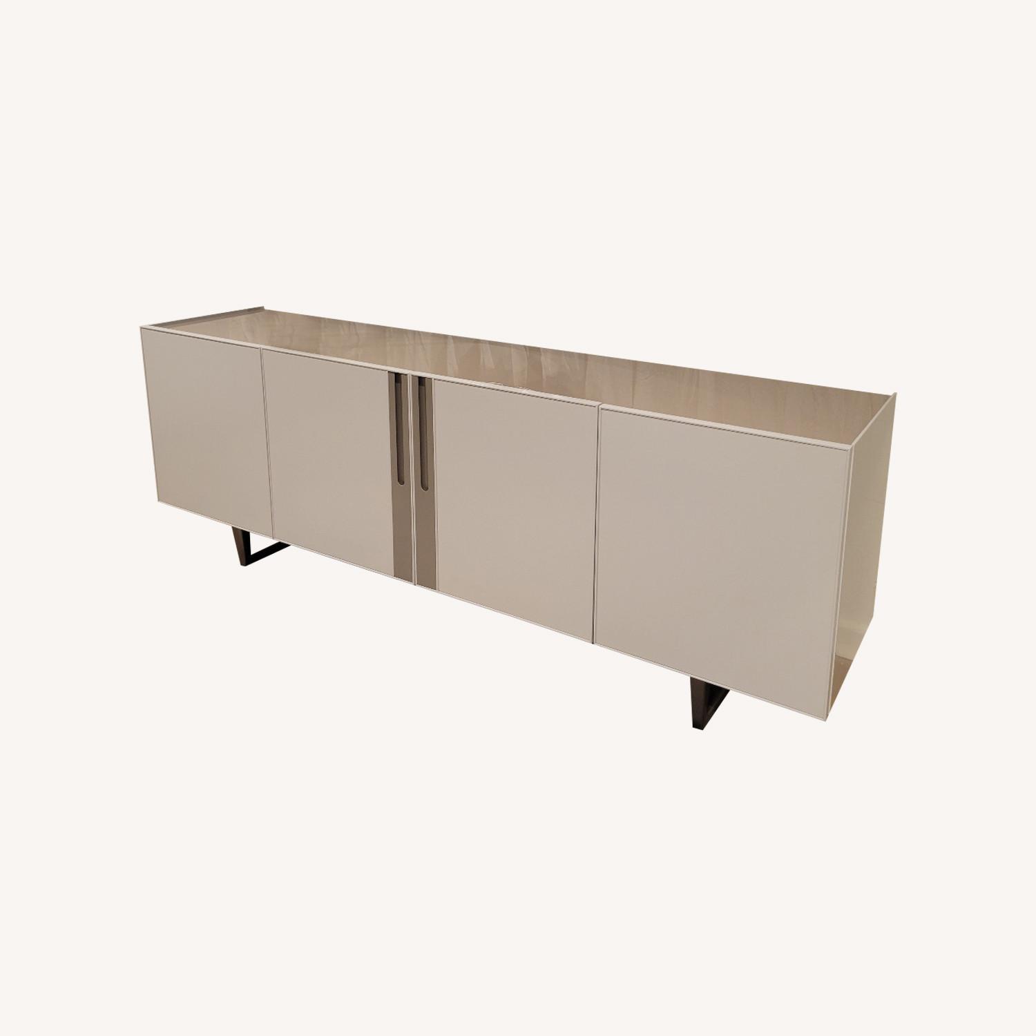 Seller's Notes:**showroom sample that needs to move out to make way for new products. Product is as good as new and has not been 'used' outside of display during our furniture market.** Buffet structure is in a gray lacquer with top in a reverse painted glass that is gray-beige. Handles are also in a grey beige lacquer with oak feet painted in metallic gray.