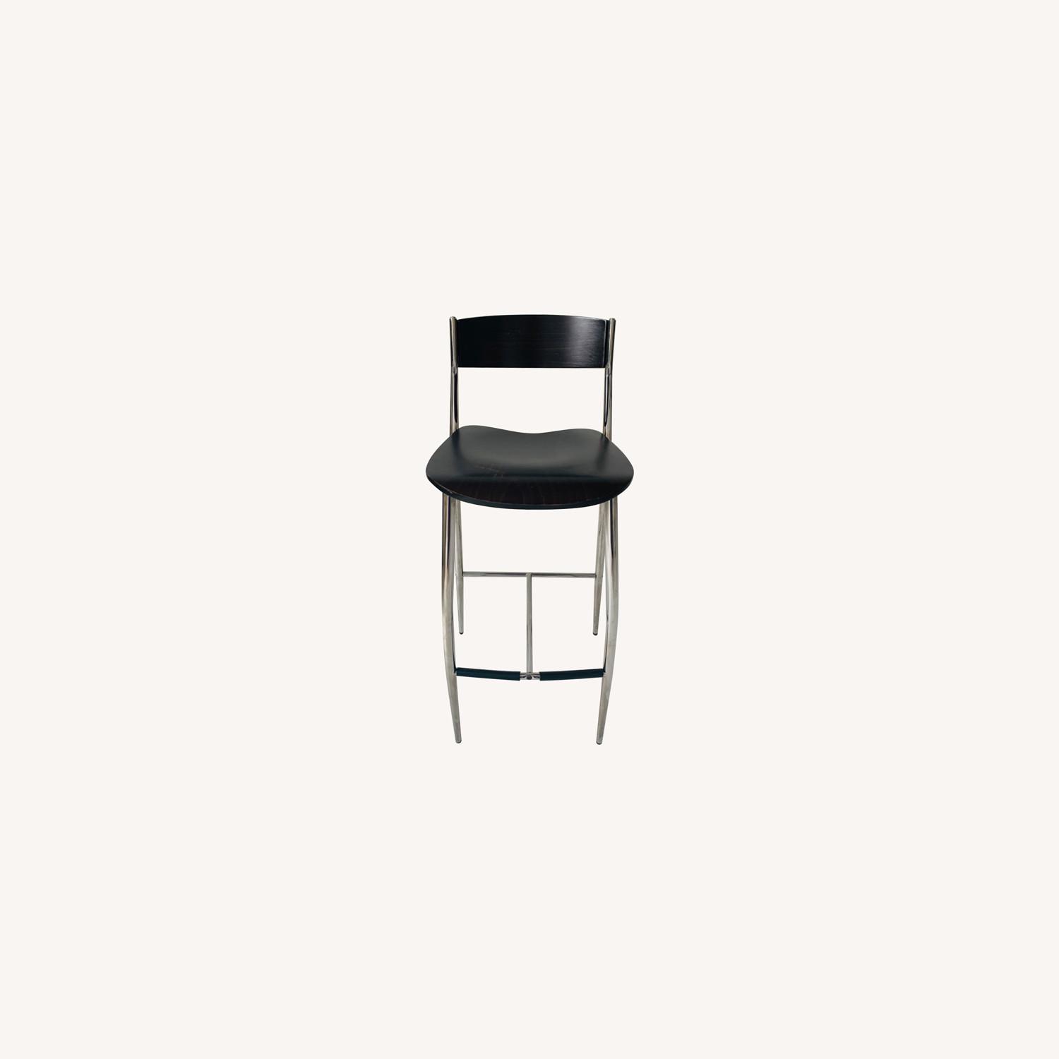 Seller's Notes:Set of 4 Baba breakfast bar stools with low backs, bowed and tapered metal legs and brand labels molded at undersides, designed by Sergio Mian, sold in DWR, manufactured by Altek. Made in Italy. Dimensions: Seat height 30” Back height 39” Width 15” Dept 17”