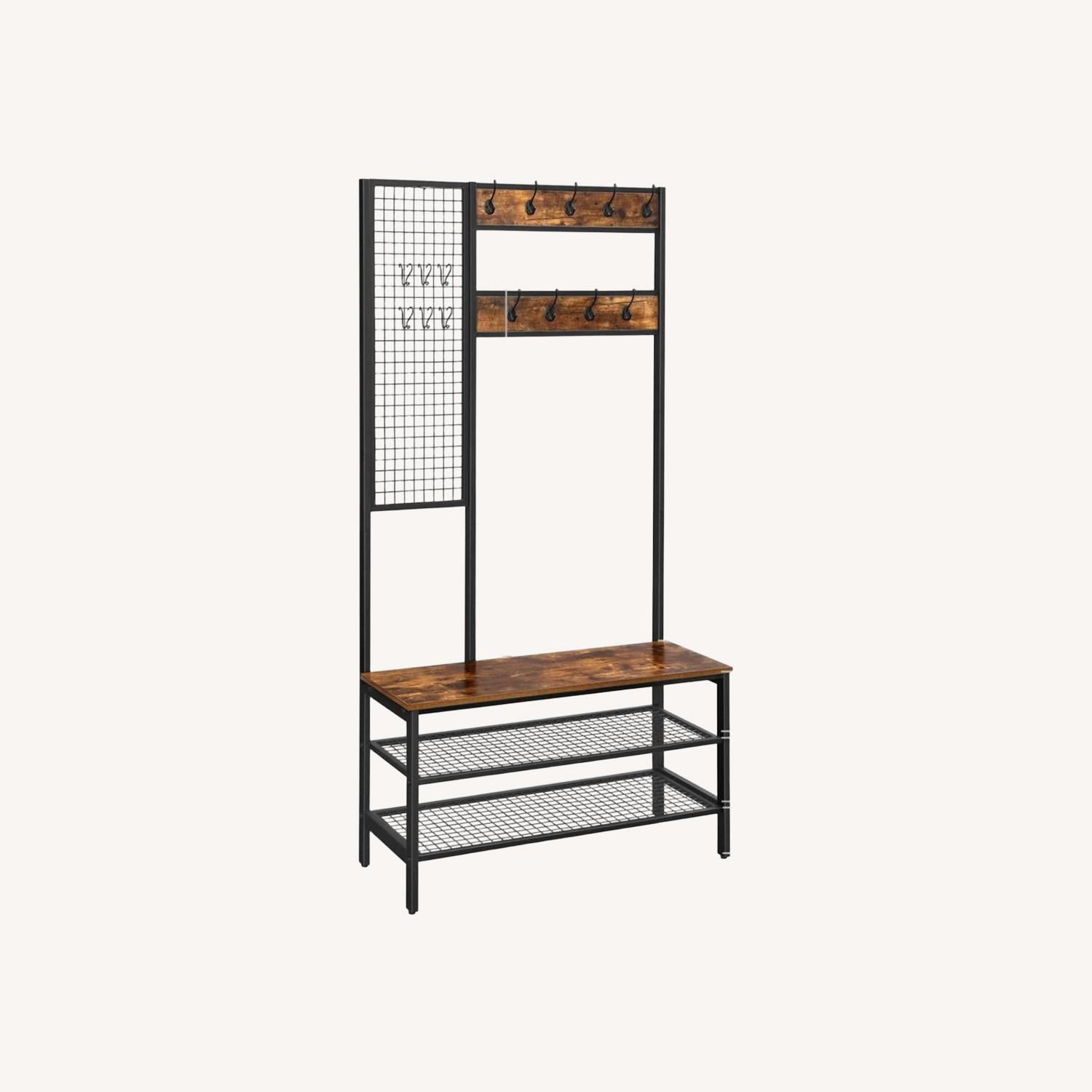 VERSATILE! 4-IN-1 DESIGN: A coat stand, grid memo board, sitting bench, and shoe shelves unite on this multifunctional hall tree! Put on your shoes while sitting on the bench (max. static load: 220 lb), grab your coat, and leave a loving note on the grid board for your loved one