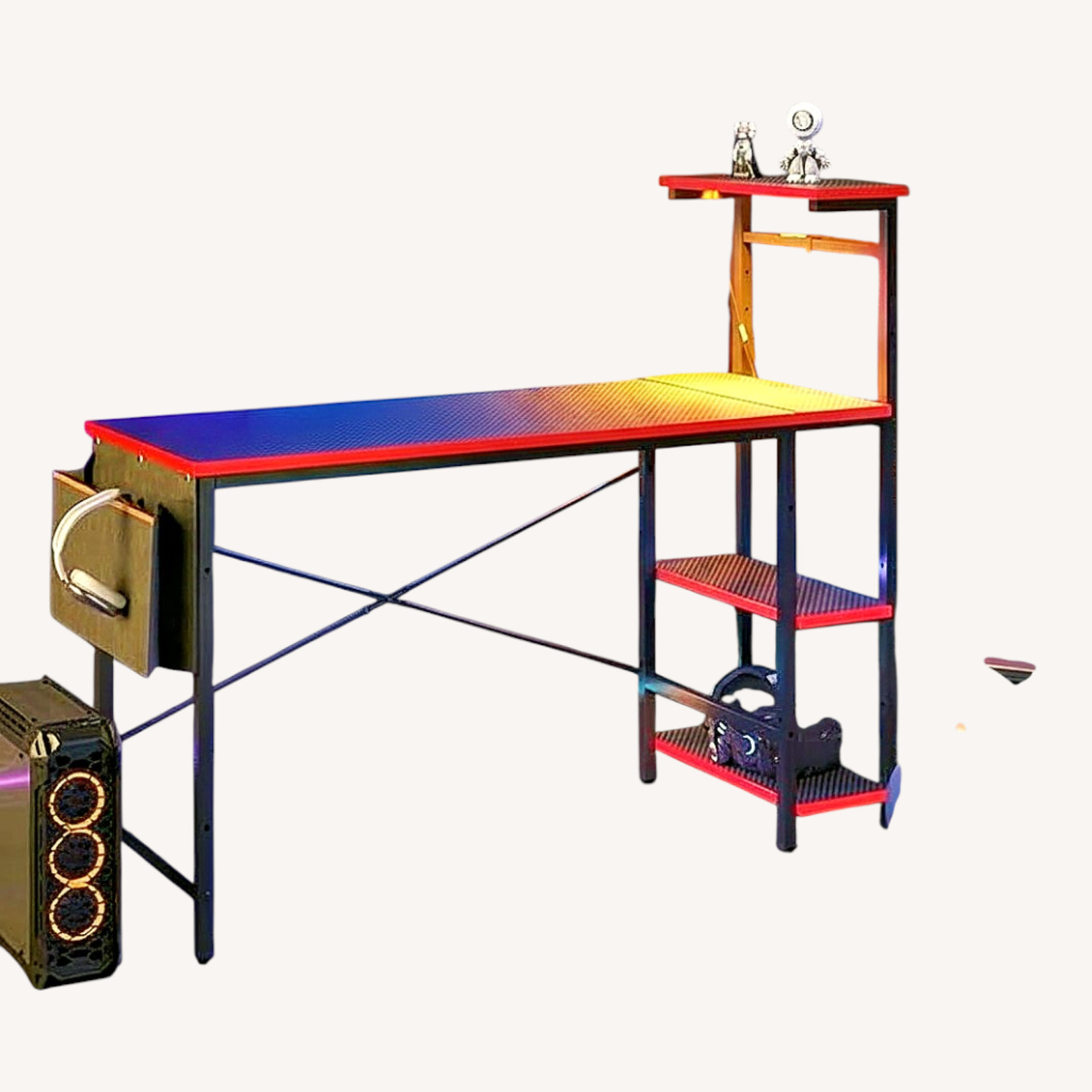 More Special: The gaming desk offers a cool LED light, it has 7 color selections and 20 dynamic modes. The LED light creates a fun and exciting atmosphere, you will completely immerse yourself in your work and writing time. The unique gaming table will be the envy of friends and colleagues around you More Design: The home office desks is designed with 4 tier shelf and provide ample storage space for your necessities, such as files, books, and more. Equipped with side storage bag and hooks to help keep your desk organized. The reversible office desk is suitable for left and right-handed More Durable: Our computer desk with shelves is made of CARB P2 Class Board and durable steel, the medium density fiberboard won't be affected by dampness and won't deform like normal wood after years of use. Designed with X crossbar to ensure the stability of the computer desk More Functional: To increase practicality, the second shelf of the desk can be changed to 3 different heights and you can remove it. The office desk is suitable for the company office, entertainment room, living room, bedroom, and study room, just enjoy your writing, working, and gaming time with this desk Best Service and Easy to Assemble: With detailed instructions, you can complete the assembly in a short time